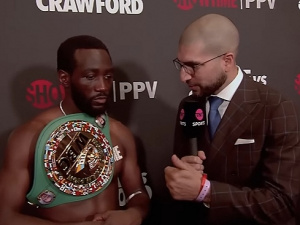 Победив техническим нокаутом в девятом раунде, Теренс стал абсолютным чемпионом в двух категориях. Сразу после поединка интервью у Кроуфорда взял популярный ведущий Ариэль Хельвани. Боец ответил на вопросы о своих чувствах после победы, возможном реванше, сравнениях с дважды абсолютной чемпионкой из США Клариссой Шилдс и целях на будущее.