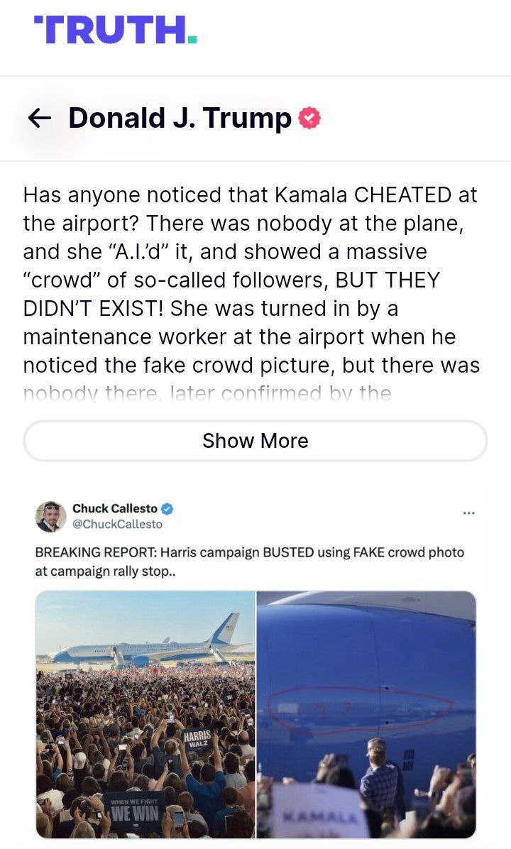 Дональд Трамп обвинил Камалу Харрис в публикации фейковой фотографии, на которой изображена толпа её «единомышленников»: