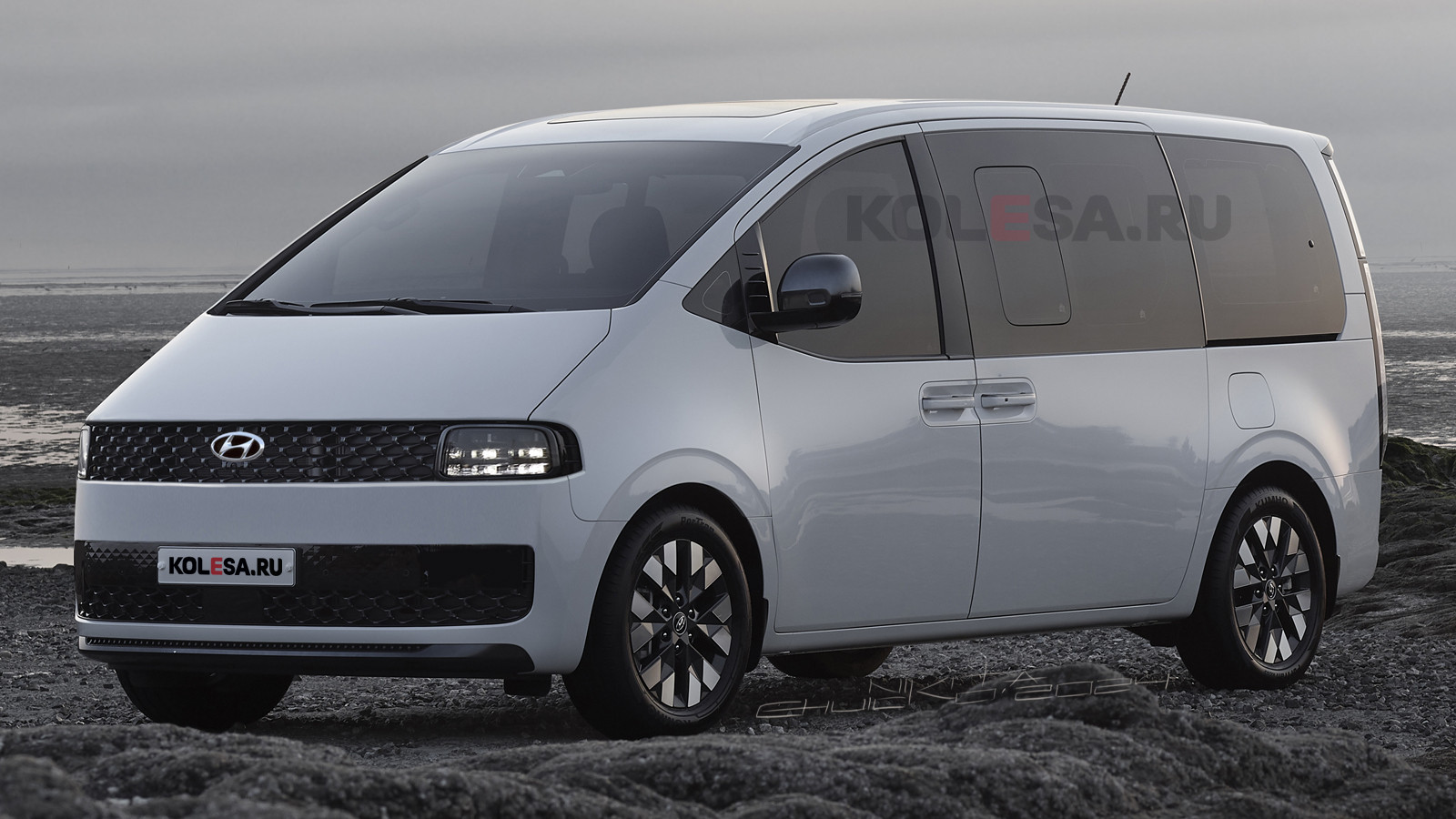 Ещё одним «носителем» передней светодиодной полоски является минивэн Staria, впервые продемонстрированный весной 2021 года. В этом случае полоска исчезла, вместо неё появились полноценные фары на своём месте, между которыми расположилась решётка радиатора.