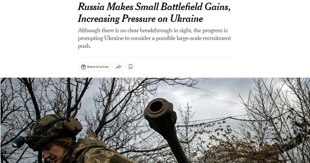 Как отмечает The New York Times, продвижение России побудило украинские власти рассмотреть возможность новой мобилизации до 500 000 солдат.