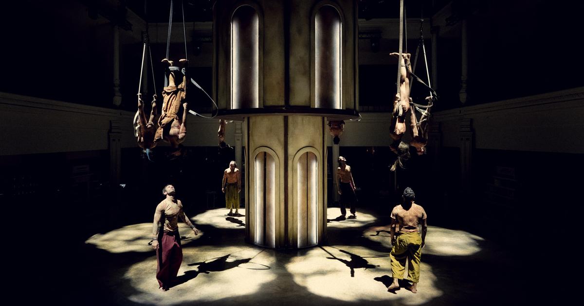 De là, les dix danseurs acrobates tournent en rond de toutes les manières imaginables : reptations au sol, tours sur la tête, vols au ciel, dans des mouvements centripètes ou centrifuges, ou suivant la spirale qui aspire les interprètes vers le sommet de la tour ou les en fait couler. Un flux de corps se dessine, costumés du violet au vert dans une gamme qui couvre la gamme des ocres. Une lumière d’or baigne la scène : voilà le vertige convoqué ! Mâts chinois, sangles aériennes, tissus, toute une suite de merveilles se déploie dans un crescendo bien lissé qui joue sans détour les beautés des tours, sur la terre comme au ciel. Merzouki déploie son savoir-faire pour emporter le spectateur dans une rêverie rythmée par une musique qui prend les tubes du classique à la louche, et les mixe sans raffinement.