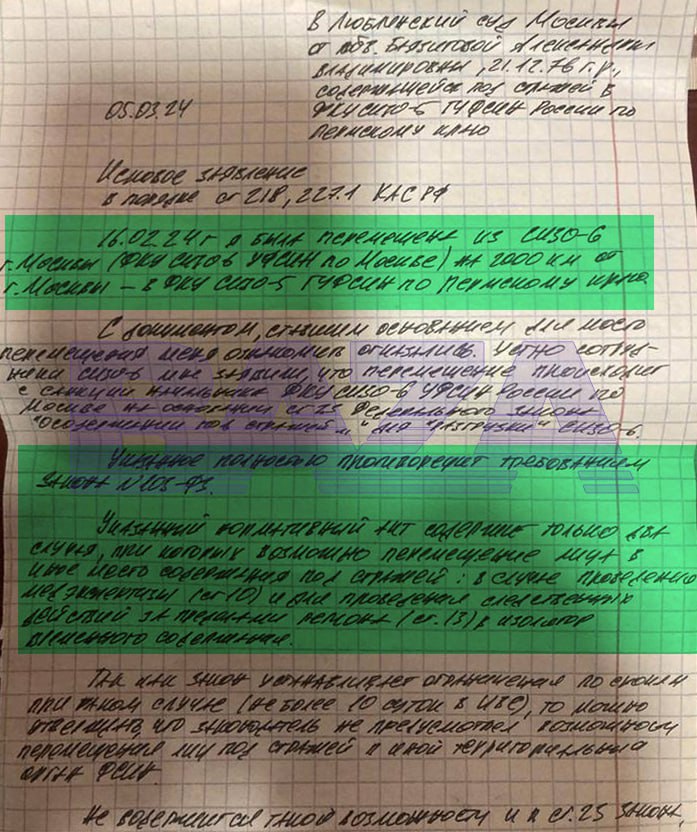 Журналистка Александра Баязитова подготовила иск на миллион рублей к ФСИН после того, как её отправили этапом еще до апелляции. По словам журналистки, даже подготовить иск ей было сложно. Сейчас женщина находится в СИЗО-5 в Пермском крае — с адвокатом она может говорить только через стеклянную перегородку и по телефону, поэтому тайны общения с защитником как будто и нет. Перед тем как передать исковое заявление адвокату, его проверяли цензоры. По закону человека можно перевезти в другое место только в двух случаях — для проведения экспертизы или для проведения следственных действий за пределами региона. По словам Баязитовой, её перевезли незаконно и ограничили в правах: адвокат и тем более родственники теперь почти не могут её навещать, у неё отобрали все книги, в том числе Уголовный и Уголовно-процессуальный кодекс, по которым она готовилась к заседаниям. Саша требует наказать ответственных и взыскать с них миллион рублей за нарушение условий содержания её под стражей. По мнению журналистки, её отправили в Пермский край, чтобы она «не отсвечивала» в Москве и не привлекала внимание к своему делу.