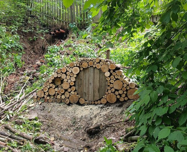 «Дом хоббита» создали художница Анастасия Стэфа и мастер Денис Букаев. Поленья между собой скреплены саморезами и гвоздями, а дверь носит декоративную функцию. Объект намерены дополнить навесами над дверцей и ручкой-кольцом.