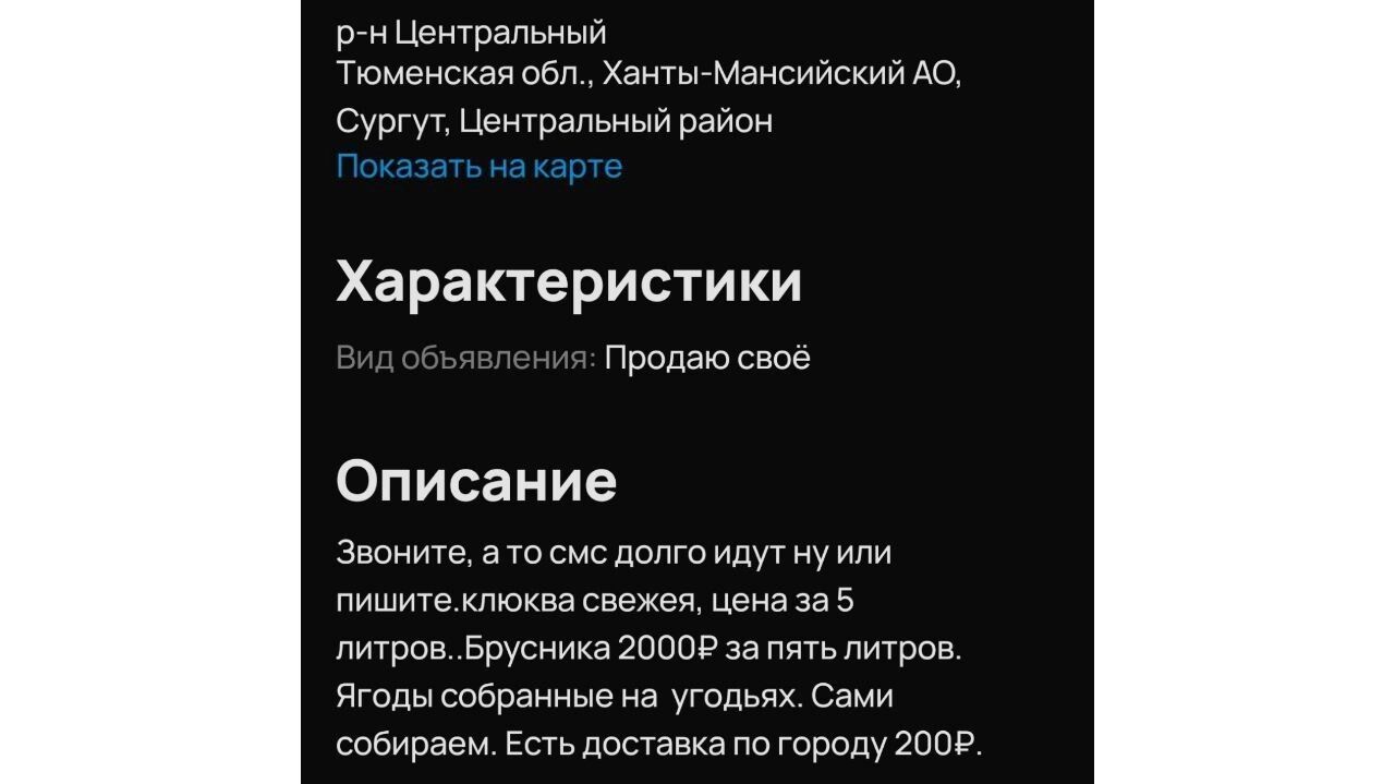 Есть и дороже. Например, сургутянин предлагает продать 5 литров ягоды за 2000 рублей. Автор объявления отмечает, что брусника собрана на лесных угодьях. Также он предлагает доставку по городу — за 200 рублей.