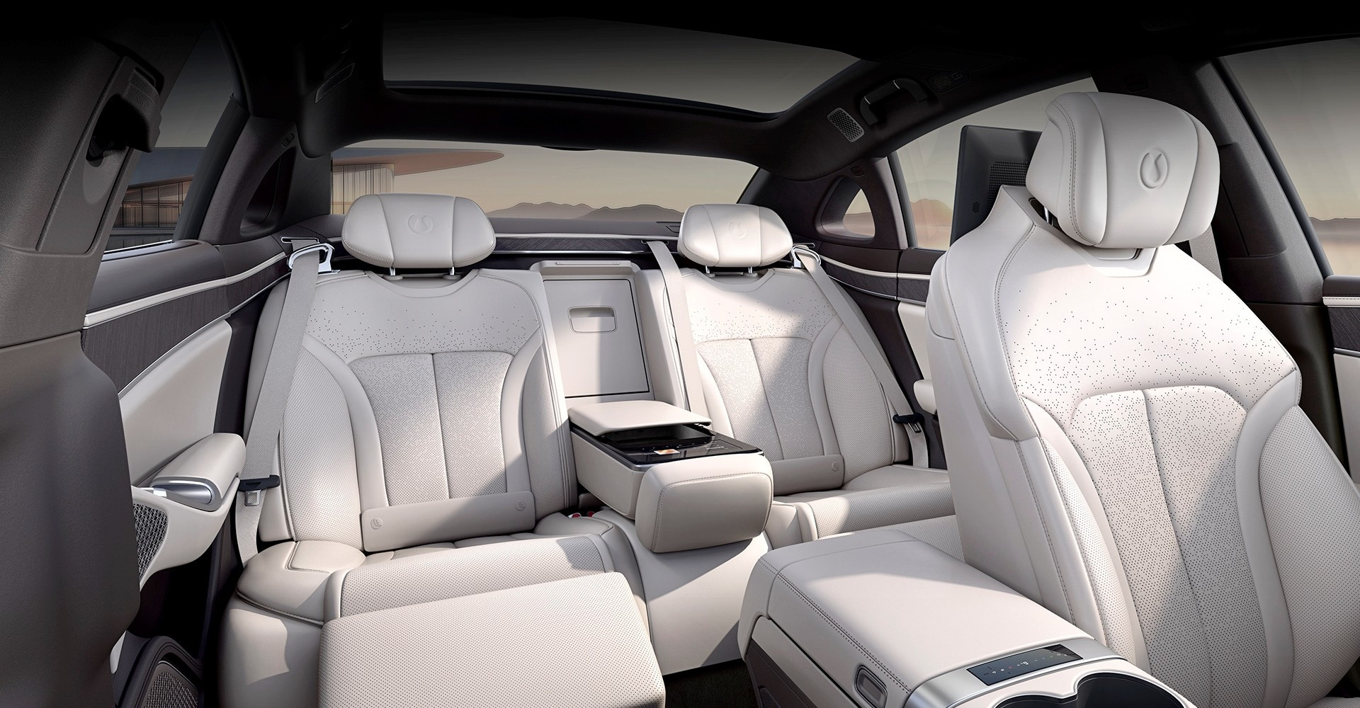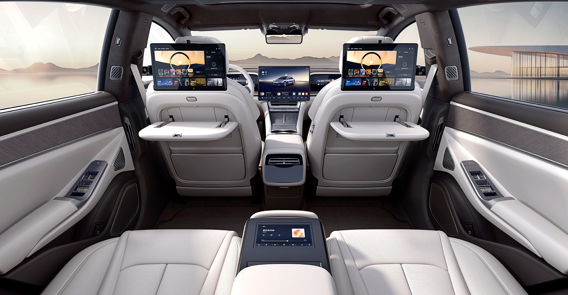 С места водителя салон Denza Z9 ничем не отличается от салона Denza Z9 GT, а вот во втором ряду у седана установлены более комфортные сиденья с множеством регулировок и выдвижными подпорками для ног. Все кресла оснащены подогревом, вентиляцией и массажёрами. На борту есть сразу два холодильника для еды и напитков — правда, второй холодильник, находящийся за центральным подлокотником заднего дивана, ограничивает возможности трансформации салона при складывании спинок. Объём багажника довольно скромный — 375 л.