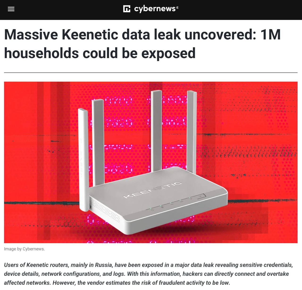 Данные почти 1 млн владельцев роутеров Keenteic из России попали в сеть. Компания уже признала утечку.