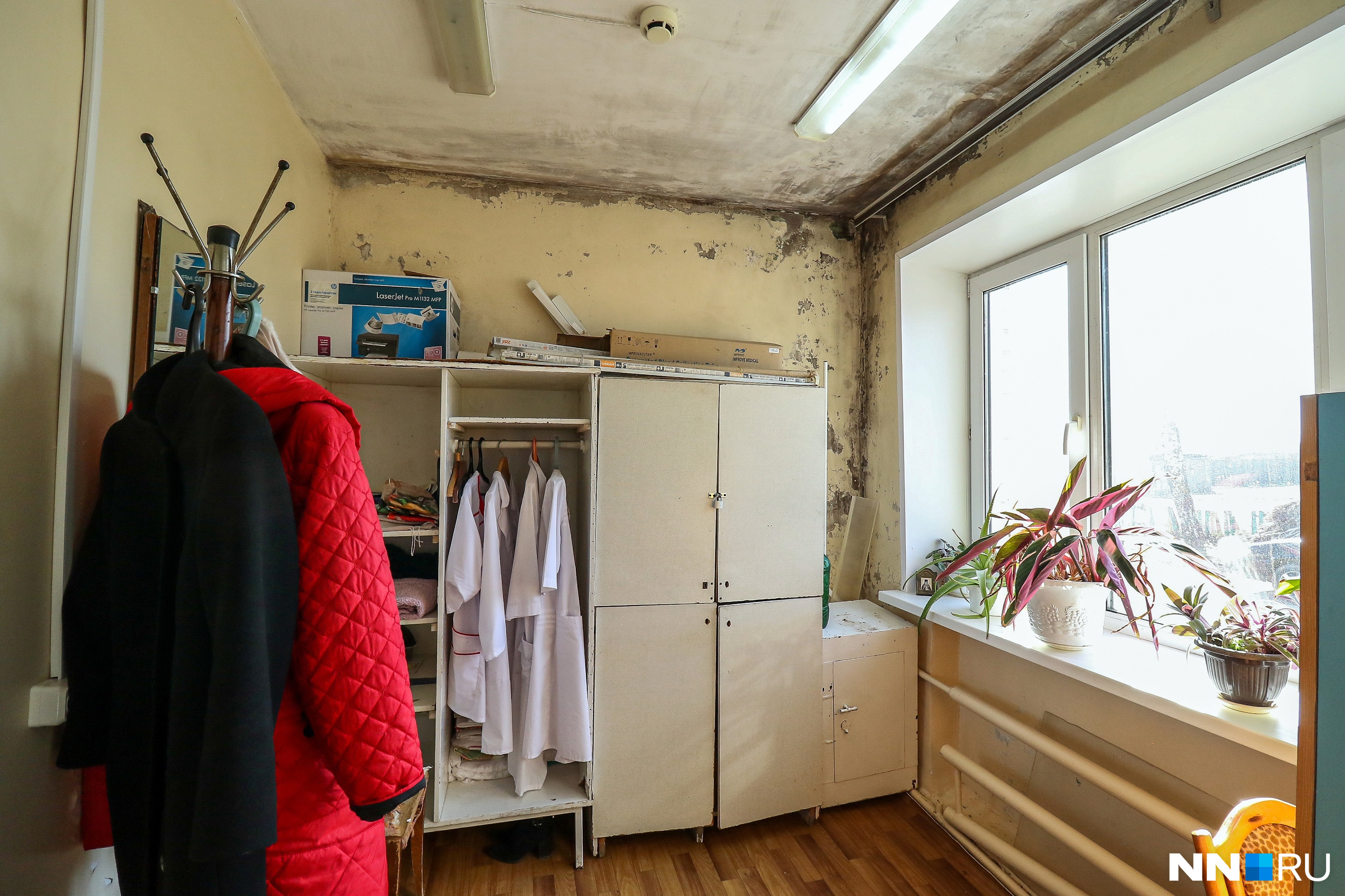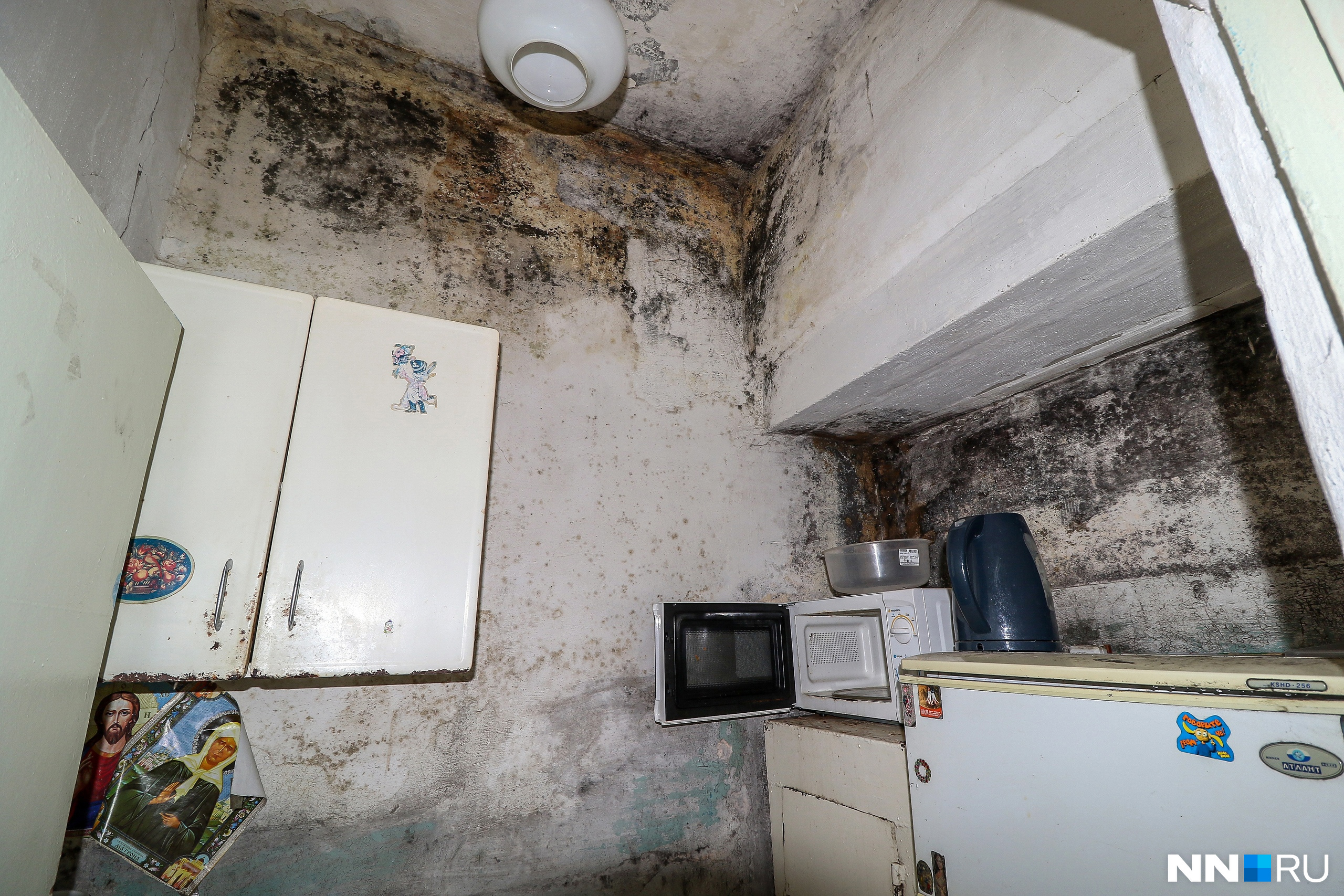 Заходишь внутрь и видишь в конце коридора стену в черных точках. За ней тесная подсобка с холодильником, микроволновкой и навесным шкафом, из-за которого смотрят с бумажных икон Иисус и Матрона Московская. Всё остальное в плесени. Стоит тяжелый запах гнили.
