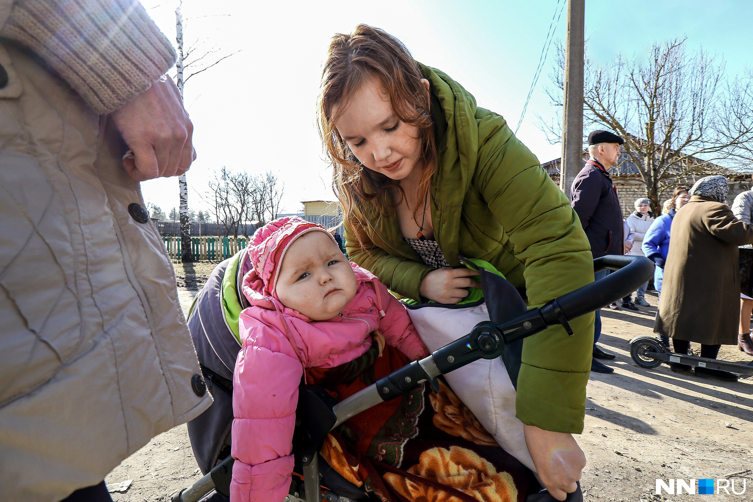 Пока Ольга рассказывала, стоя около гремячевской амбулатории, о том, как сложно рожать и лечить детей в Кулебакском районе, возле появилась молодая женщина с коляской. В ней сидела полная девочка. Гремячевцы принялись показывать в их сторону, чтобы мы взяли интервью и у них тоже.