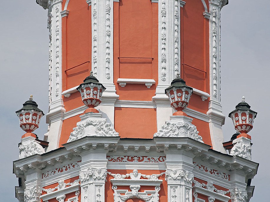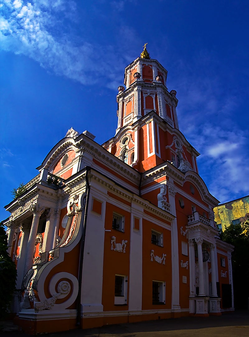 Церковь Архангела ГавриилаНа сегодняшний день "Меншикова башня" 1707г. одна из самых красивых в Москве. Не все храмы могут похвастаться таким количеством украшений снаружи.Всюду - на колоннах, прямоугольных пилястрах, даже между окнами - размещены скульптуры, каменные цветы и другие великолепные украшения, сделавшие здание бесподобным произведением искусства.