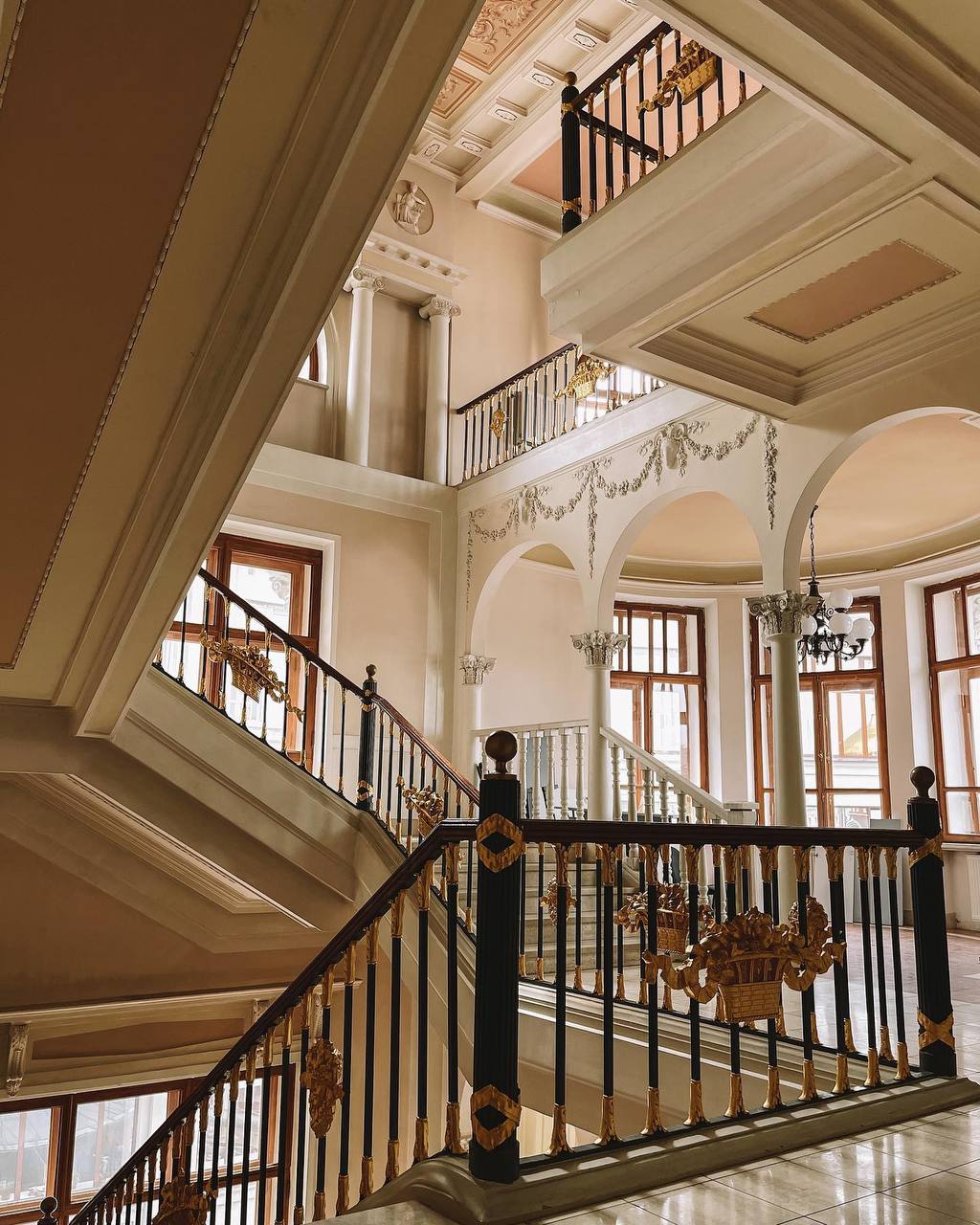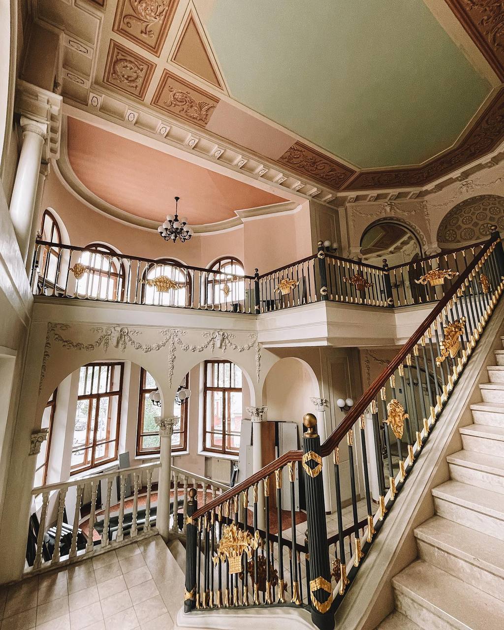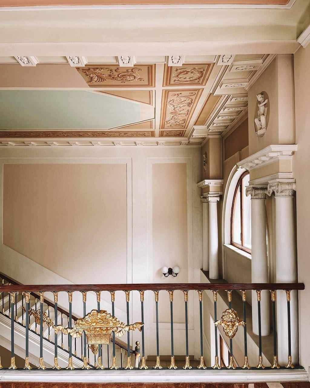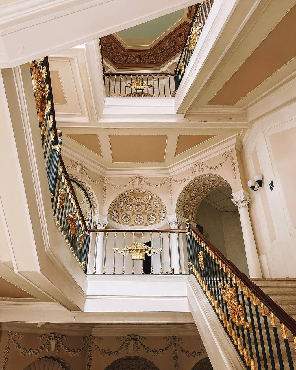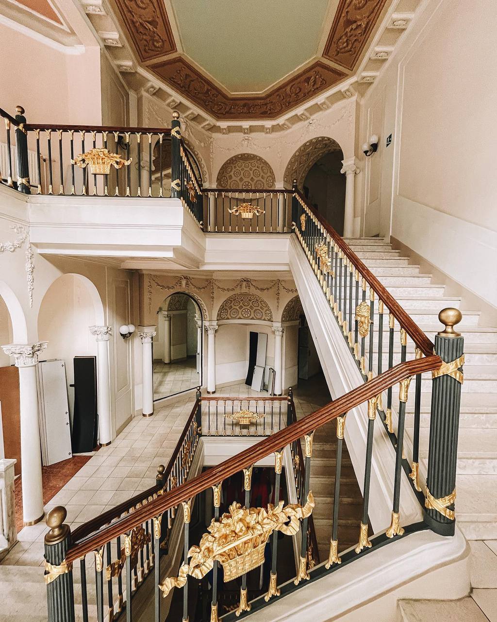 На лестничных перилах сохранились золотые корзинки с цветами, так же лепнина на стенах и на потолке.