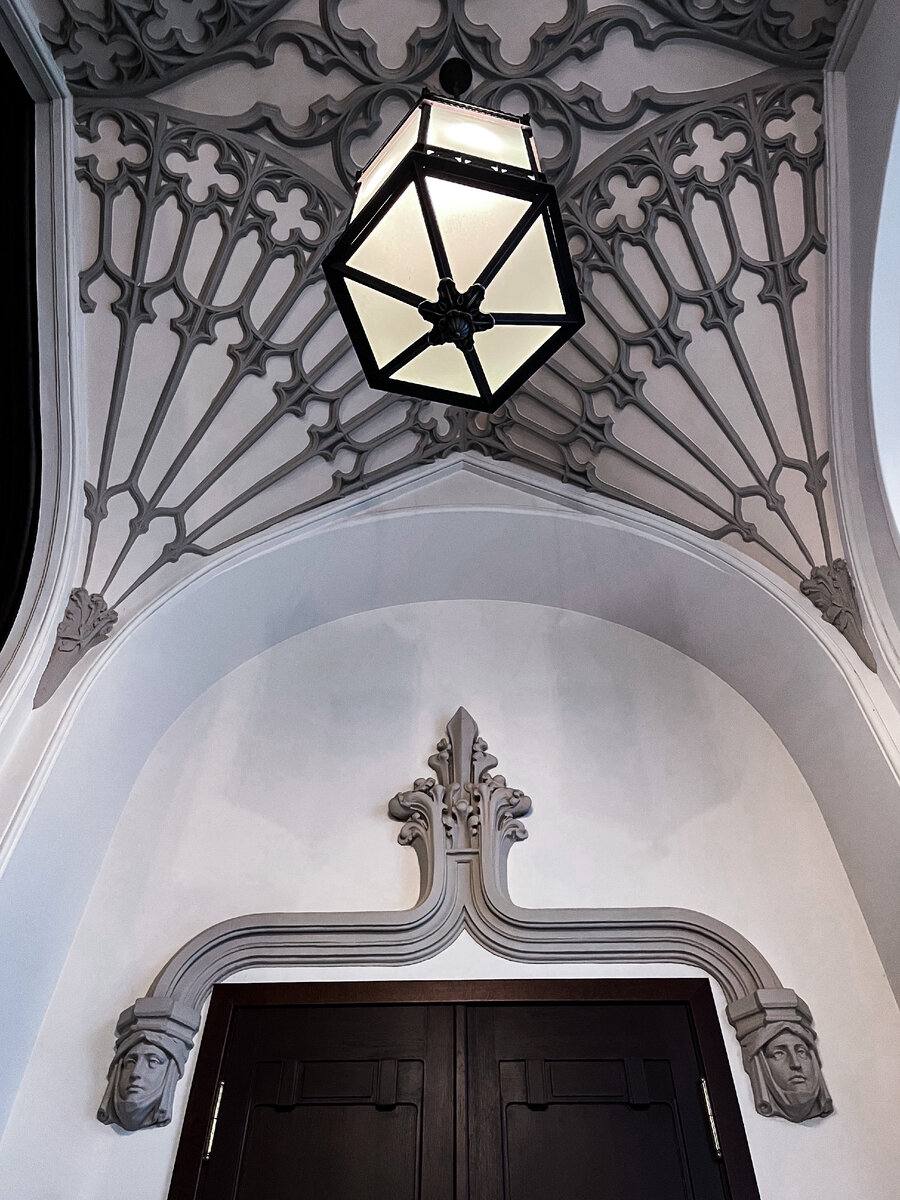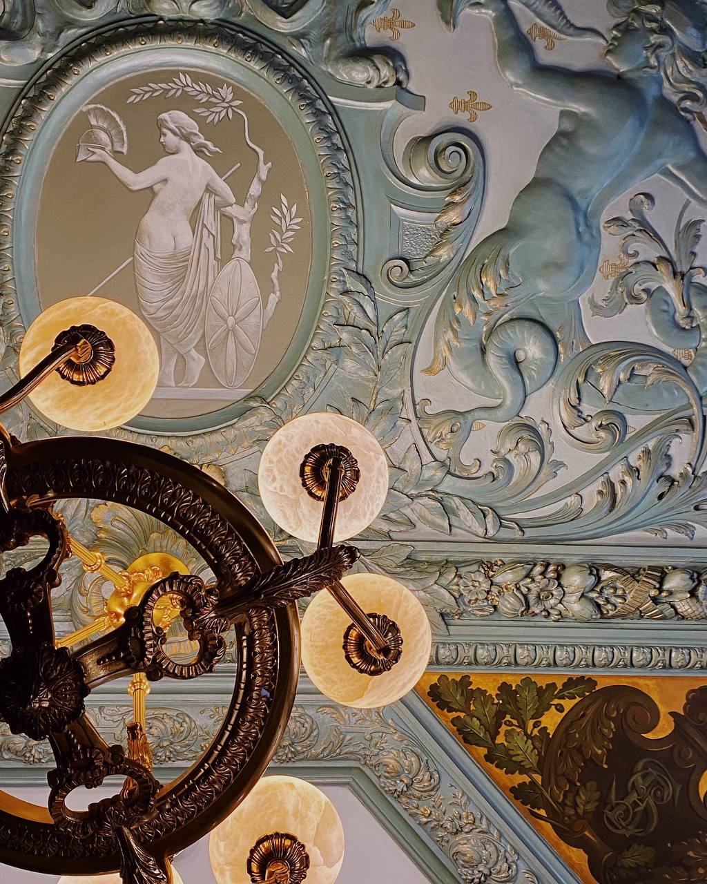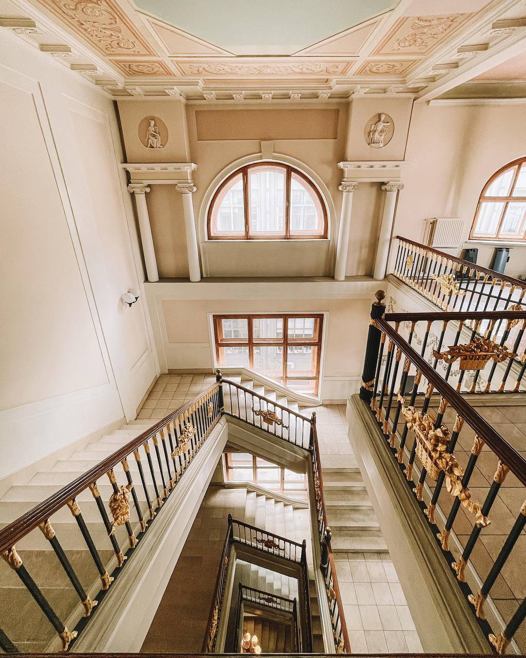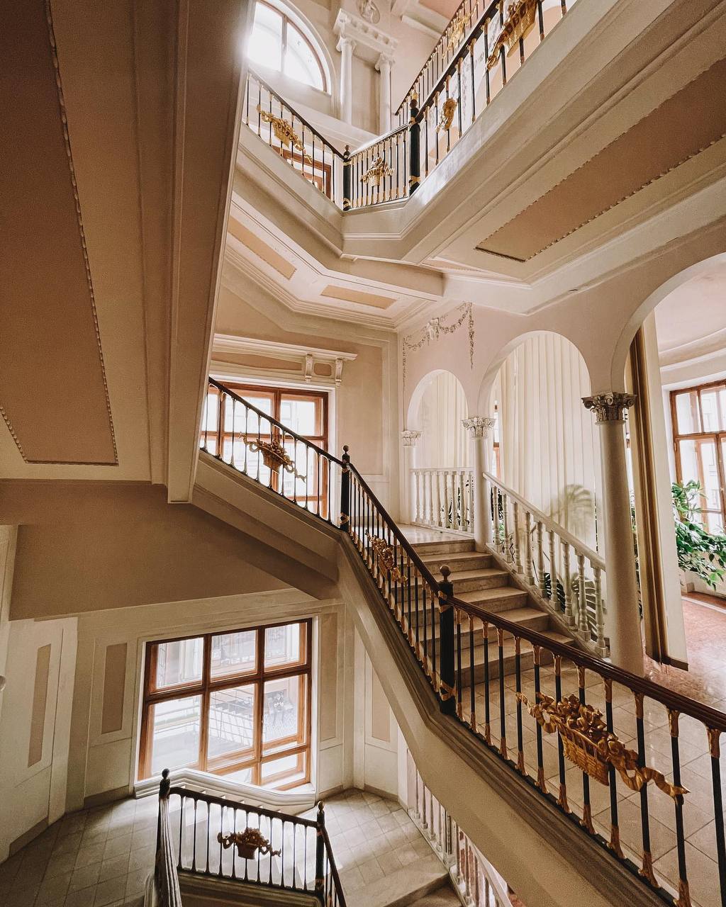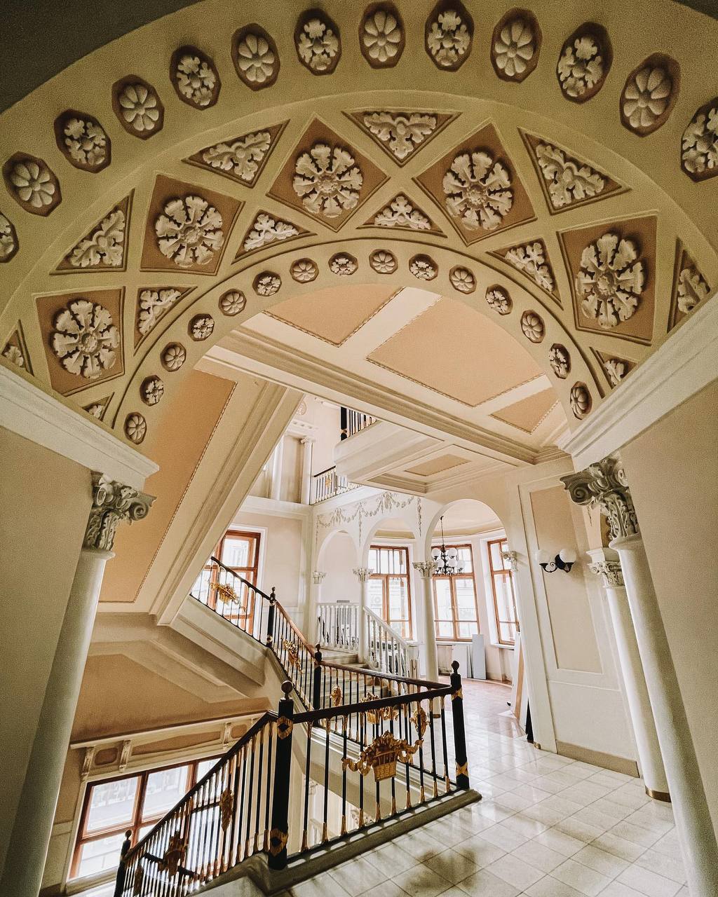На лестничных перилах сохранились золотые корзинки с цветами, так же лепнина на стенах и на потолке.