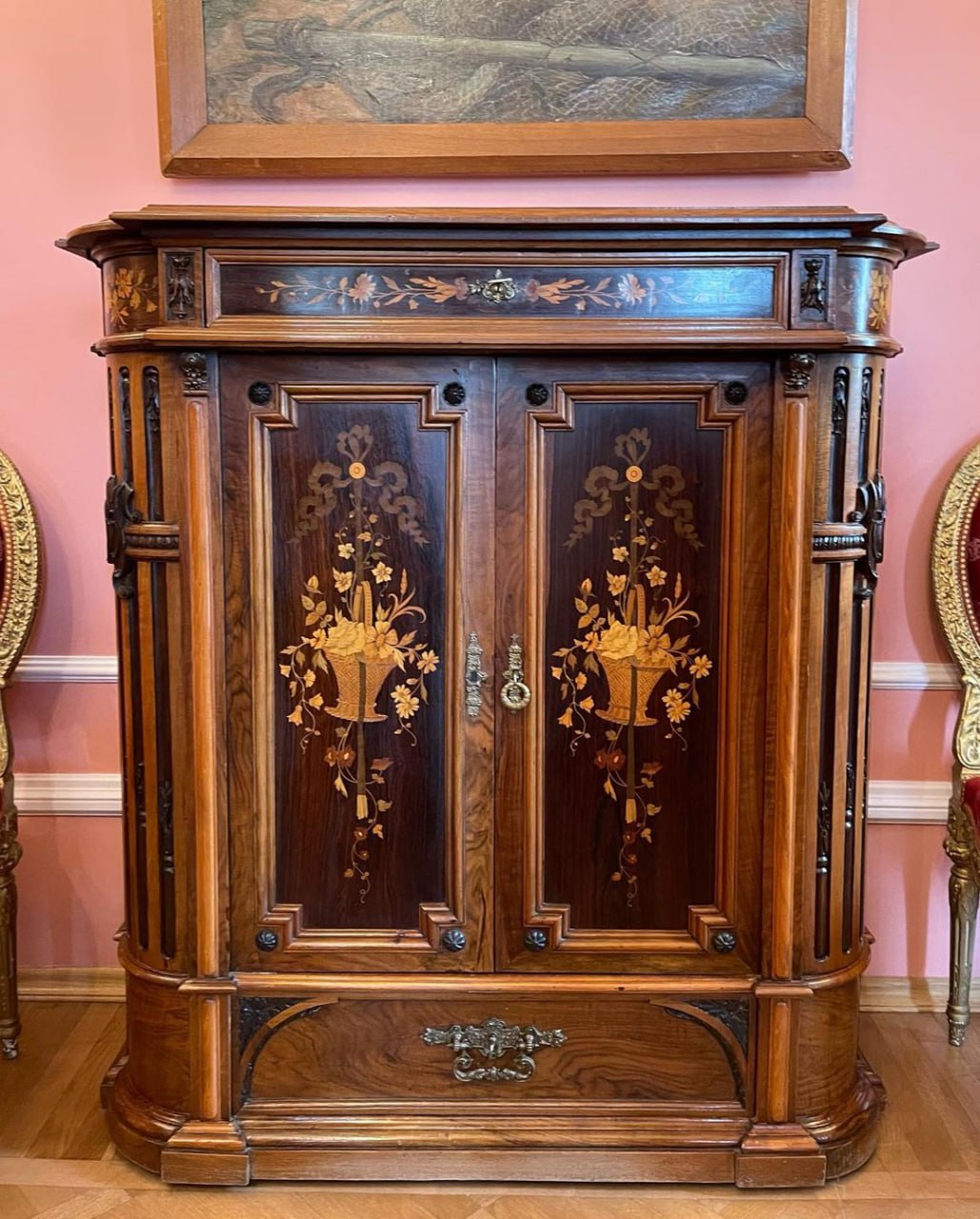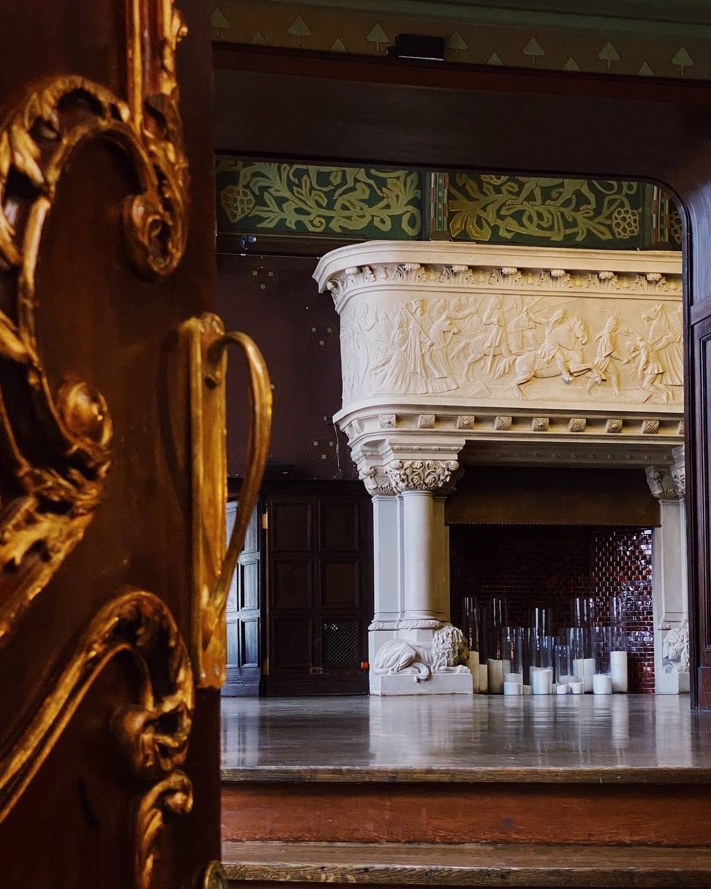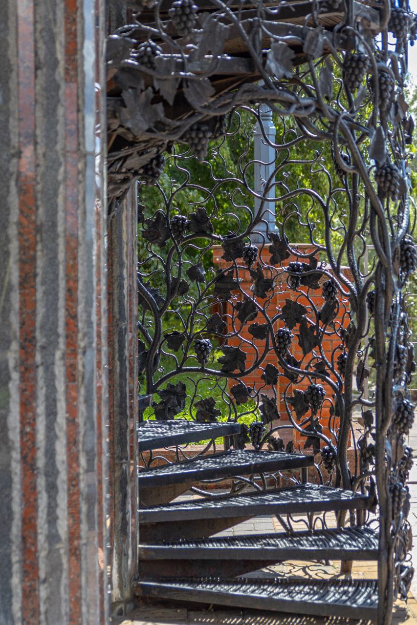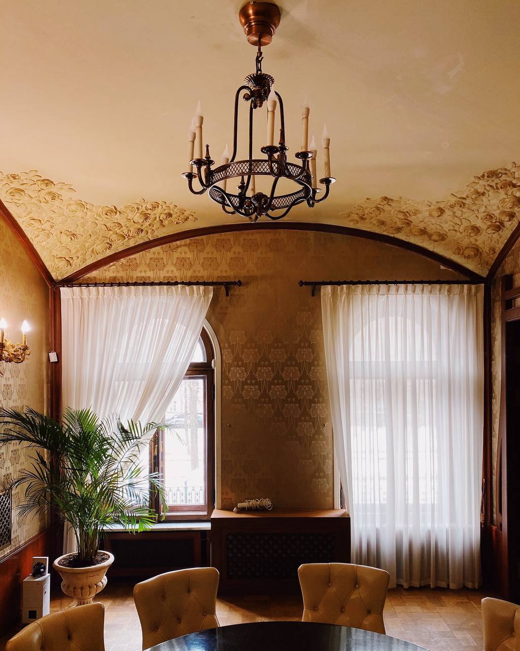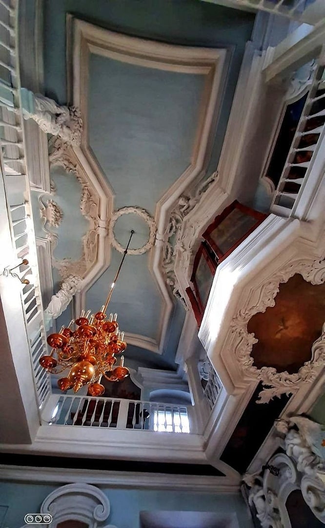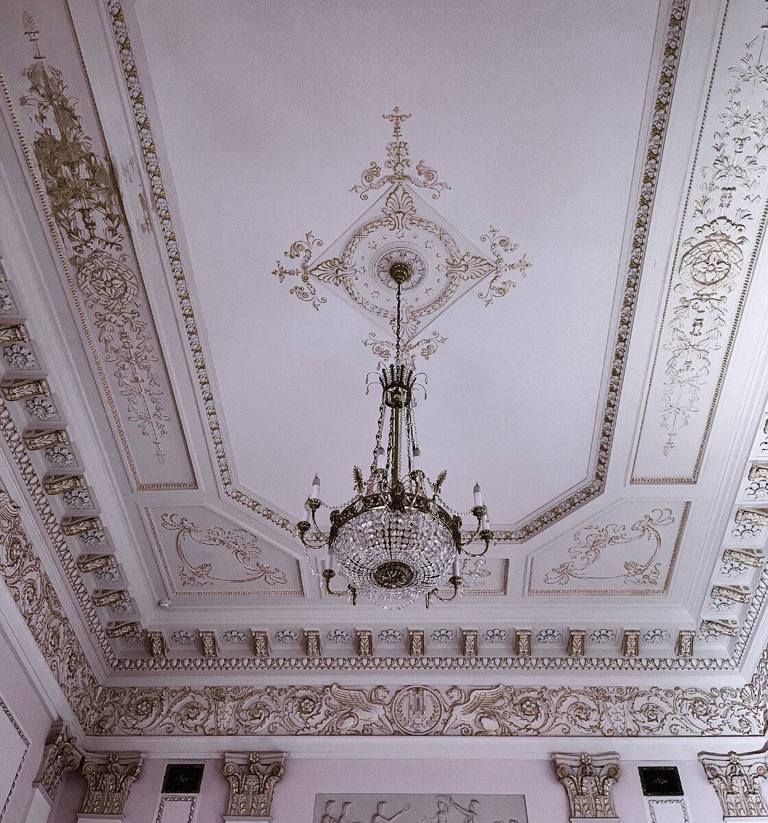 На лестничных перилах сохранились золотые корзинки с цветами, так же лепнина на стенах и на потолке.