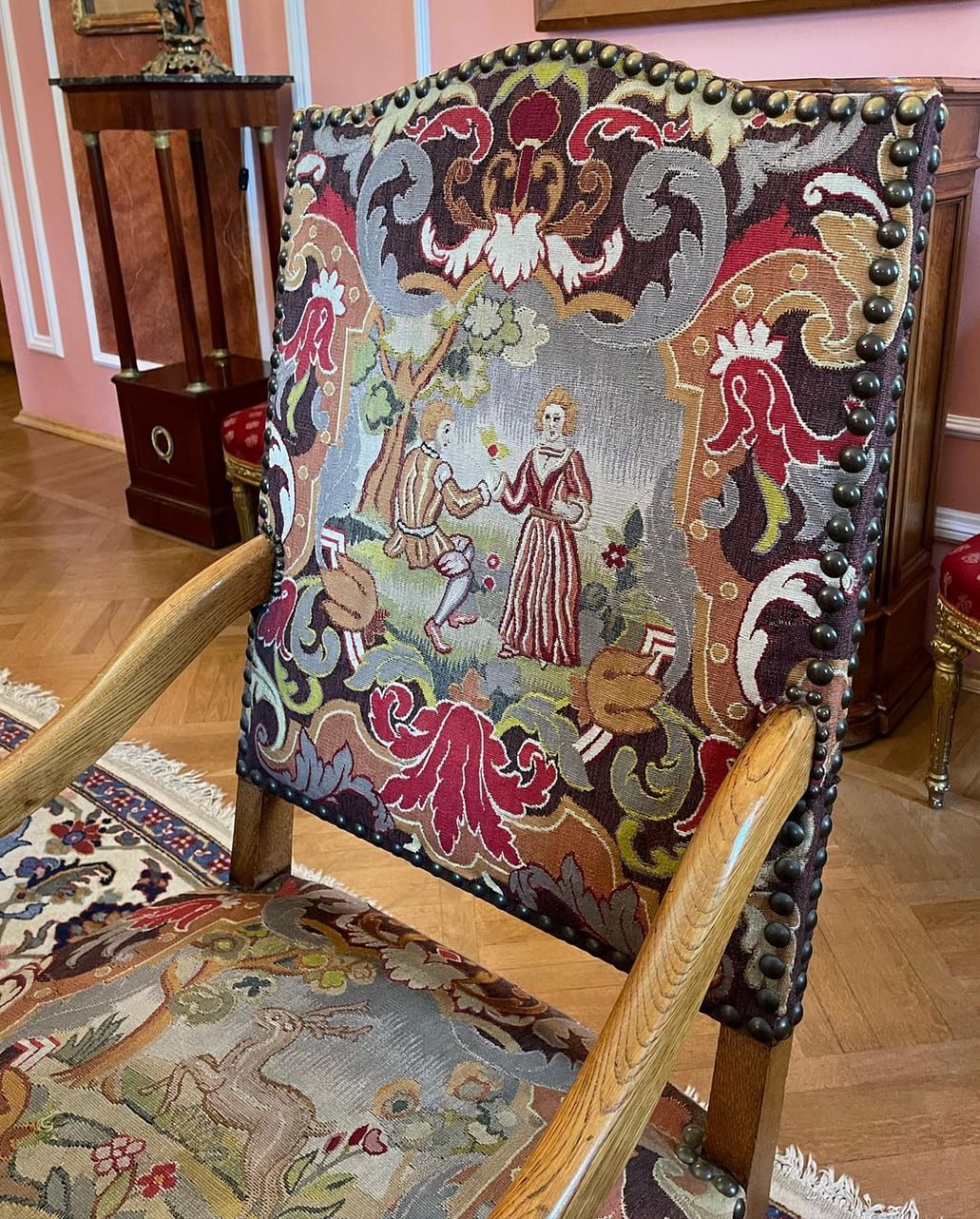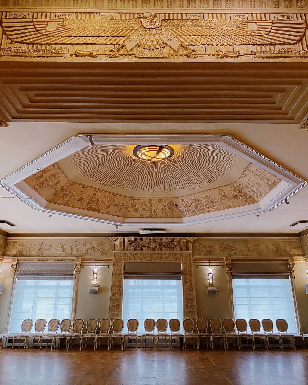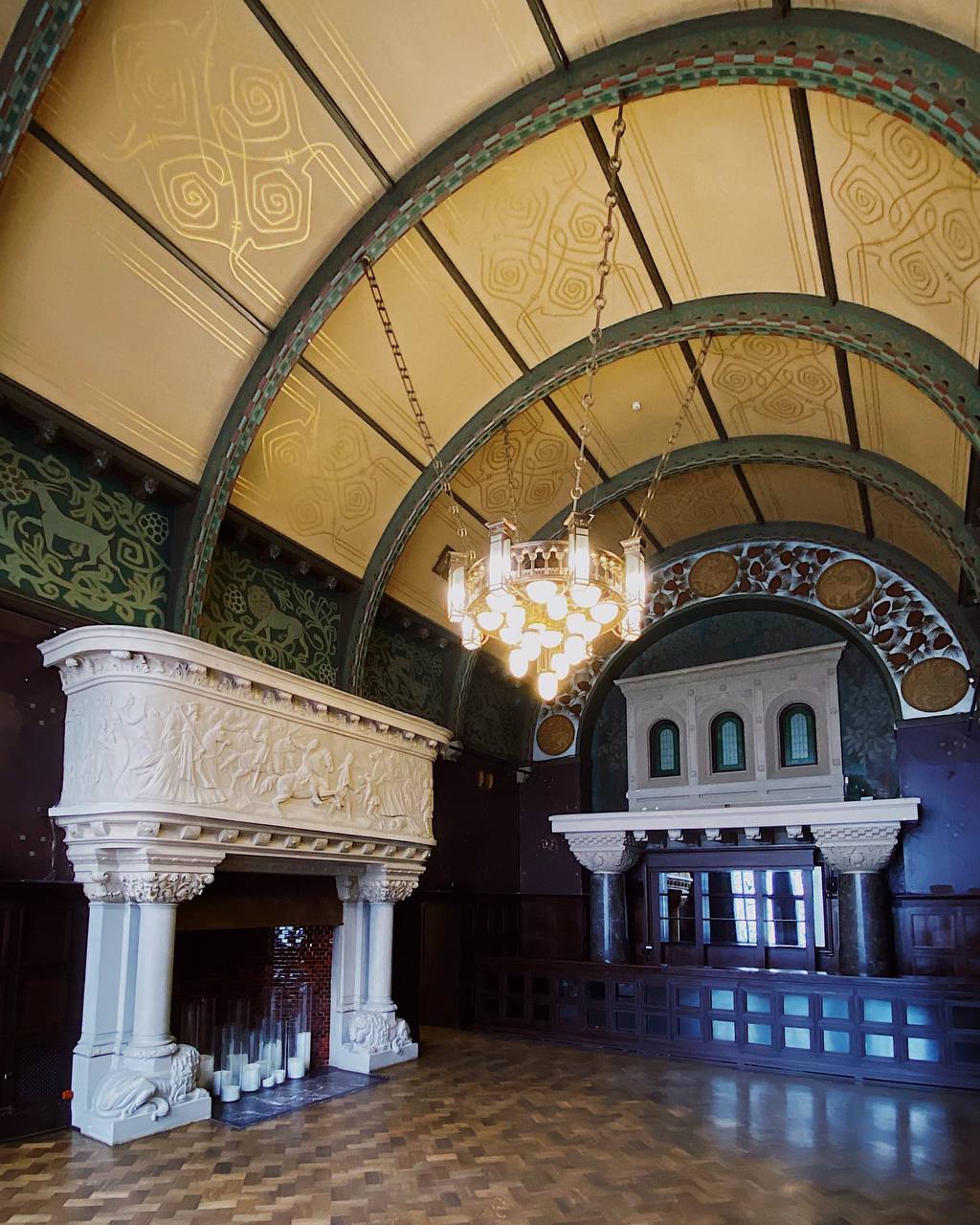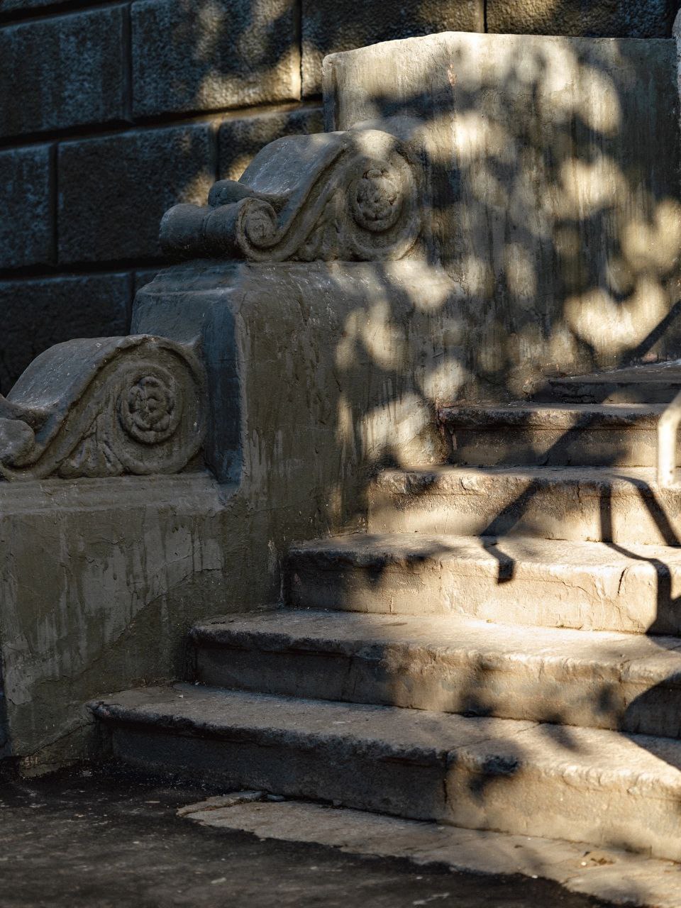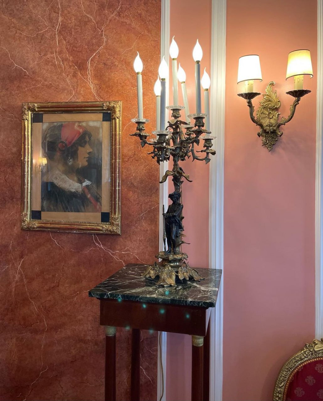 На лестничных перилах сохранились золотые корзинки с цветами, так же лепнина на стенах и на потолке.