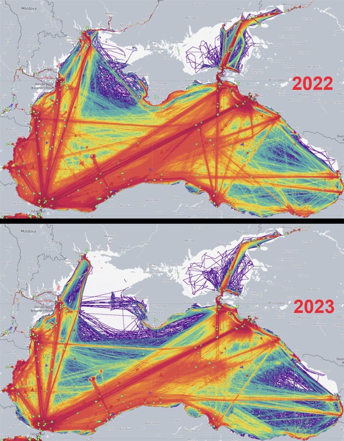 На схеме: Трафик на Чёрном море 2022 и 2023 годы