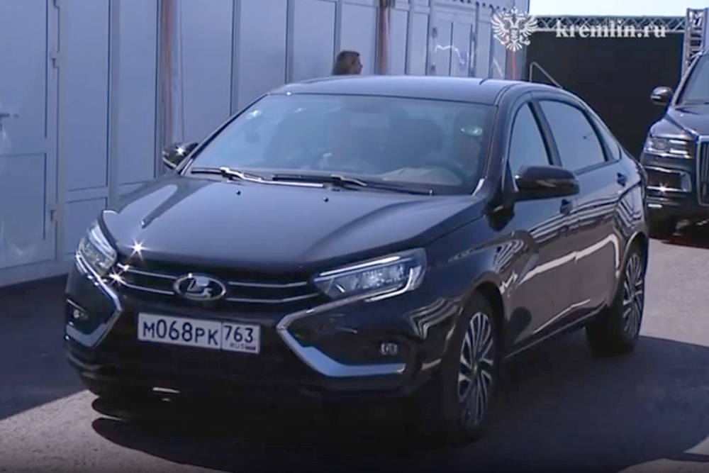 Путин прибыл на церемонию на седане Lada Aura чёрного цвета с госномерами "М068РК 763". Автомобиль создан на базе Lada Vesta второго поколения и имеет на 250 мм удлинённую колёсную базу, комфортабельную заднюю часть салона, улучшенную шумоизоляцию, уникальную отделку из натуральной кожи и расширенное опциональное оснащение. Под капотом - "безвтыковый" двигатель 1.8 Evo мощностью 122 л.с., он работает в паре с вариатором.