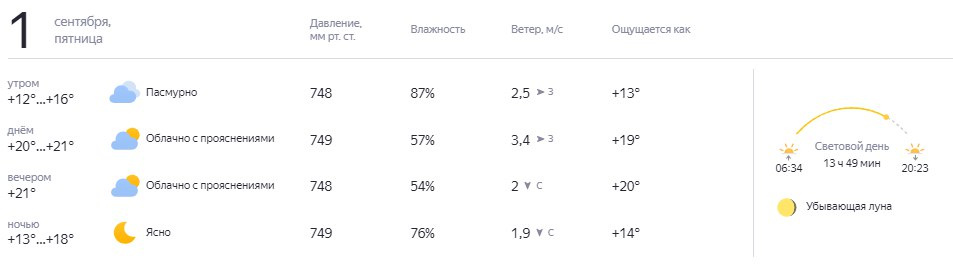 По прогнозу сервиса «Яндекс.Погода», в День знаний ожидают теплую погоду, температура поднимется до +21 градуса, но будет облачно с прояснениями. Утром влажность составит 87%, а днем — 57%. Несмотря на высокую температуру в утренние часы, синоптики уверены, что погода за окном будет ощущаться как +13 градусов, а днем как +19 градусов.