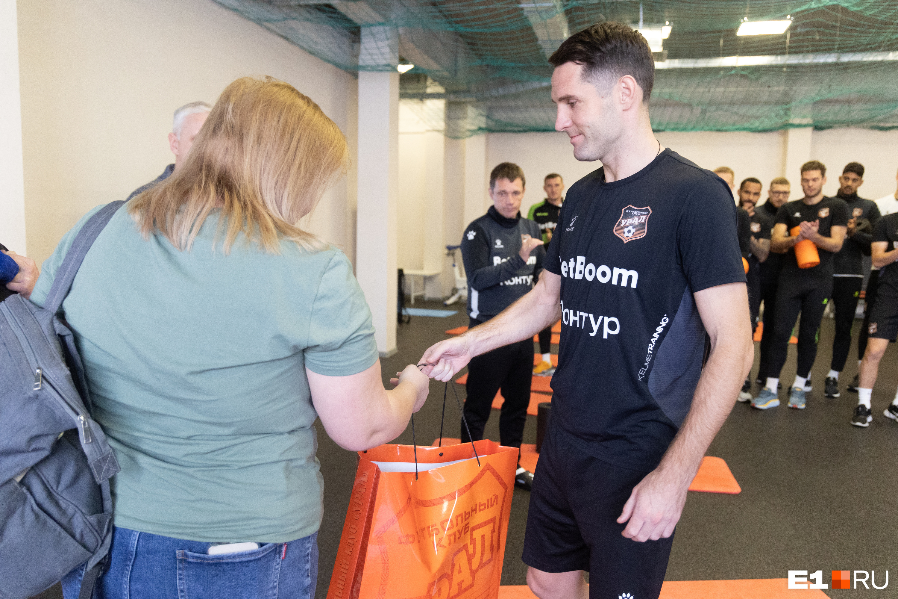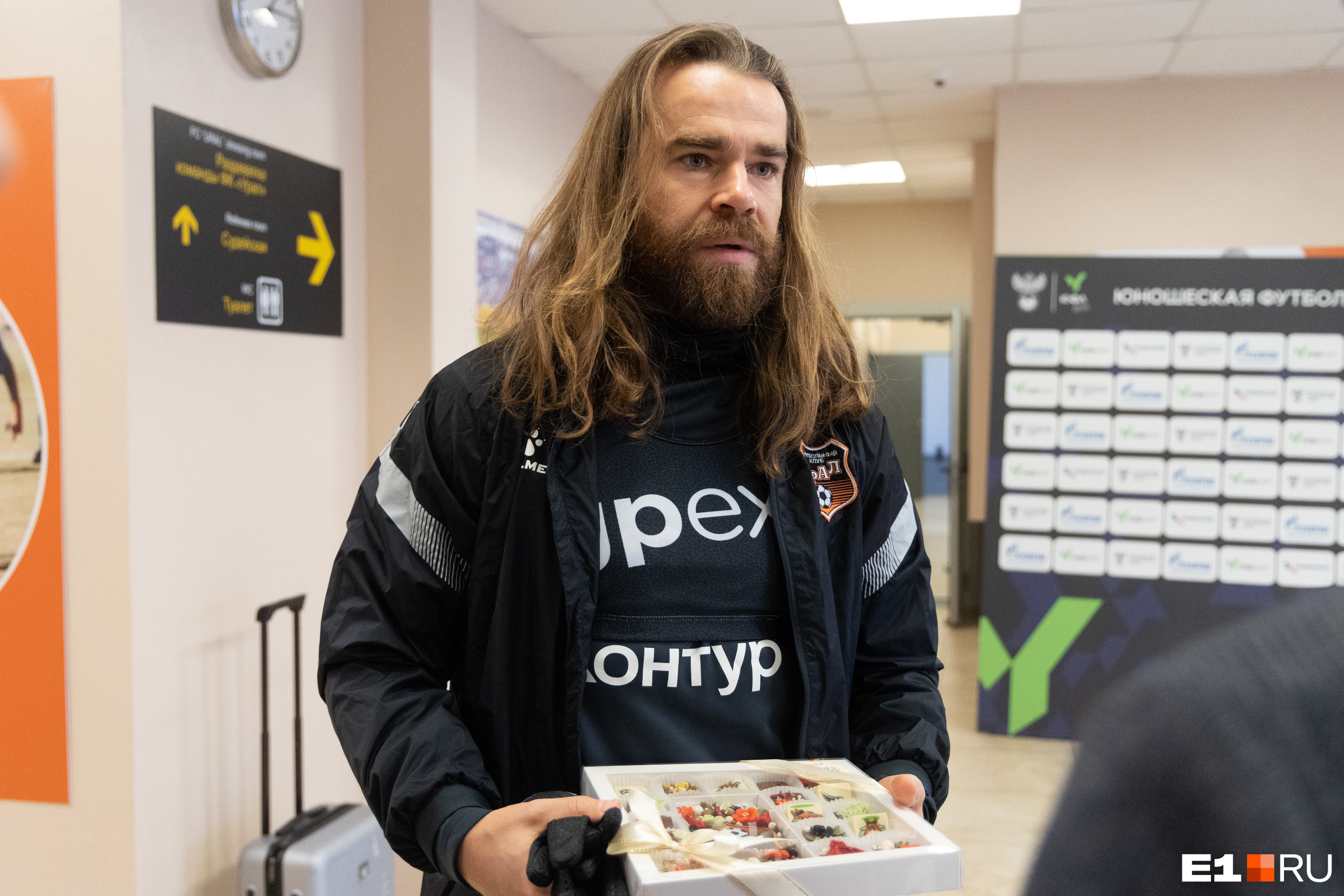 Ксения подарила капитану команды Денису Кулакову набор шоколада с символикой «Урала»: эмблемой и талисманом клуба — шмелем.