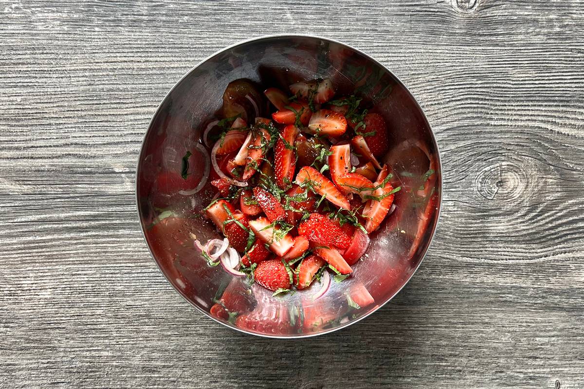 Шаг 4. В маленькой миске с помощью венчика смешайте оливковое масло, оставшиеся 2/3 ст. л. бальзамического уксуса и свежемолотый перец. Добавьте клубнику с базиликом к помидорам и луку, залейте все заправкой и перемешайте.
