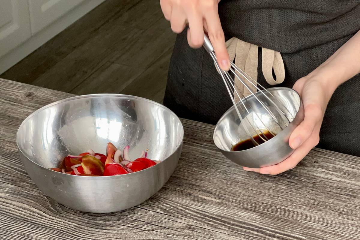 Шаг 2. Добавьте к томатам и луку соль, сахар и 1/3 ст. л. бальзамического уксуса. Аккуратно перемешайте, чтобы не повредить мякоть, и оставьте настояться на 5—7 минут.