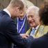 The Queen deadpans "here we are with all the lads" as her pages hold up the train of her dress.