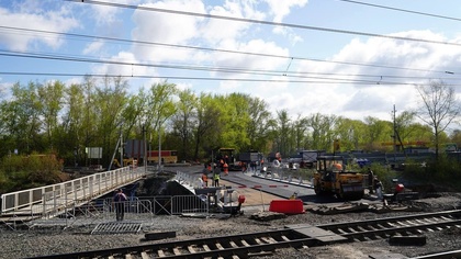 Так, подрядчик уже уложил первый слой асфальта со стороны улицы Пригородной. Сейчас специалисты приступили к асфальтированию поверхности мостового сооружения.