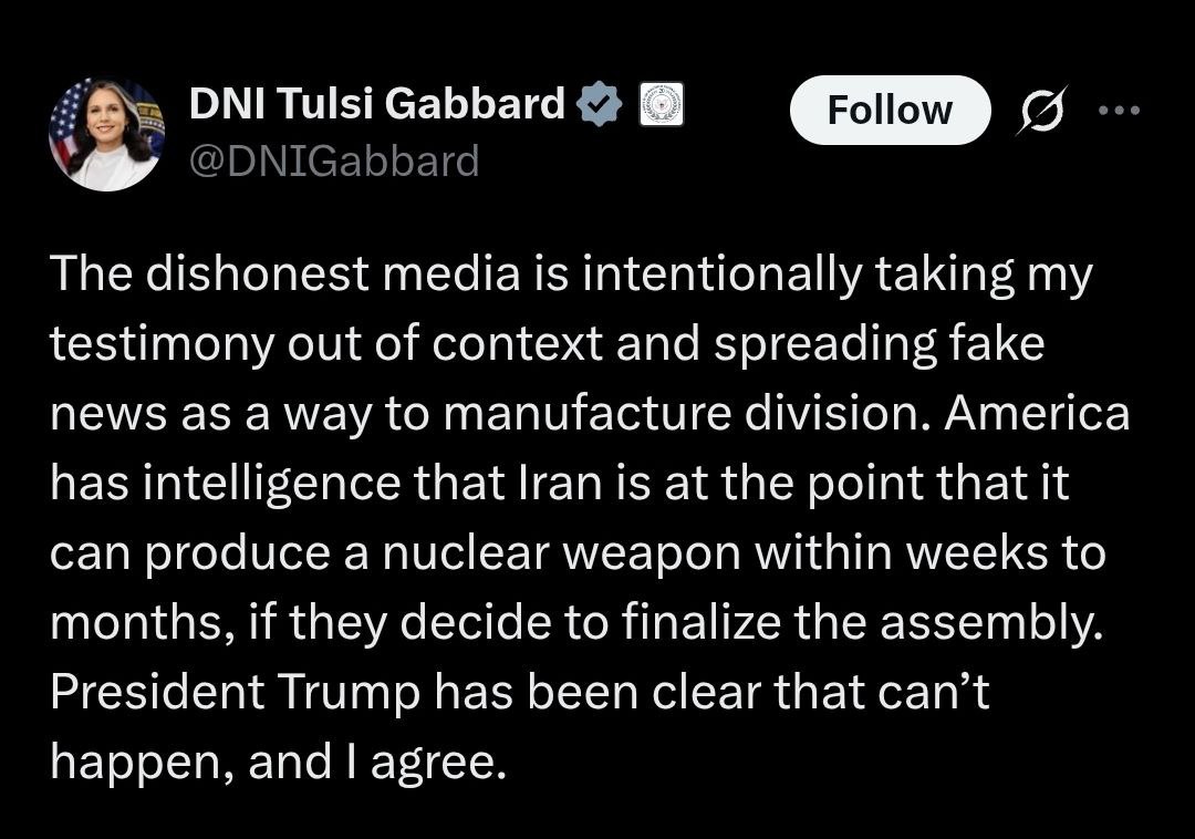 ❗️🇺🇸 «Иран может произвести ядерное оружие в течение недель»: Тулси Габбард сдала назад