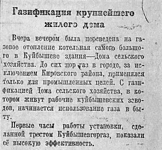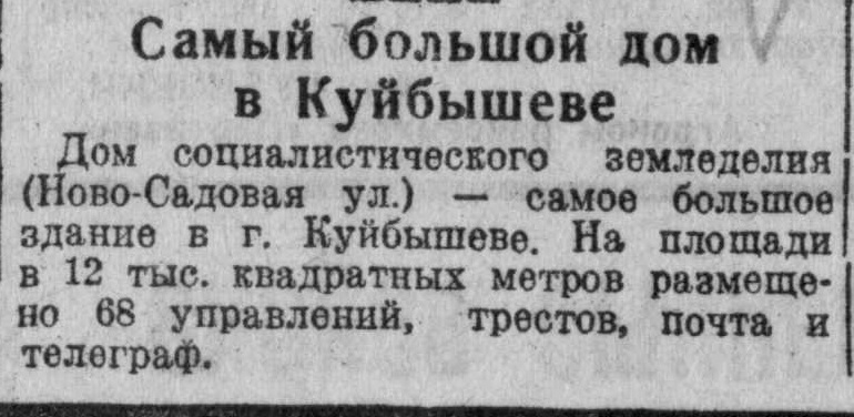 Тем не менее даже в таком «половинчатом» виде Дом сельского хозяйства был огромен по меркам Куйбышева. Что подтверждает заметка из «Волжской коммуны» от 30 июня 1938 года.