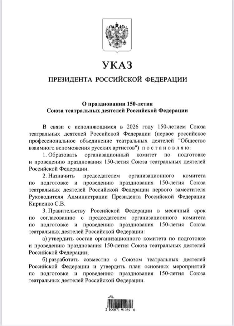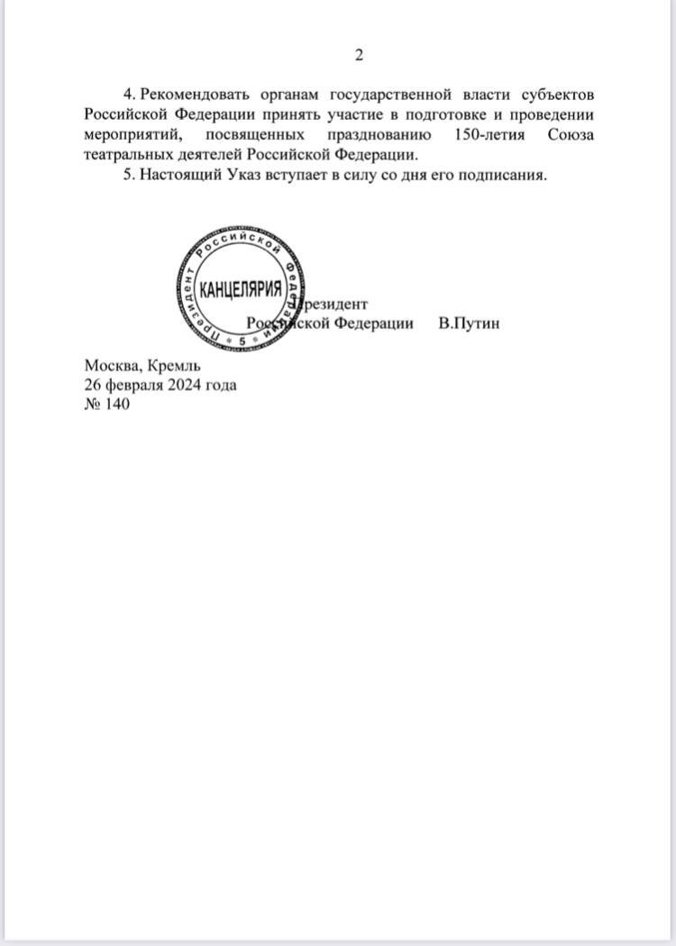 ❗️Владимир Путин подписал указ о праздновании 150-летия Союза театральных деятелей Российской Федерации.