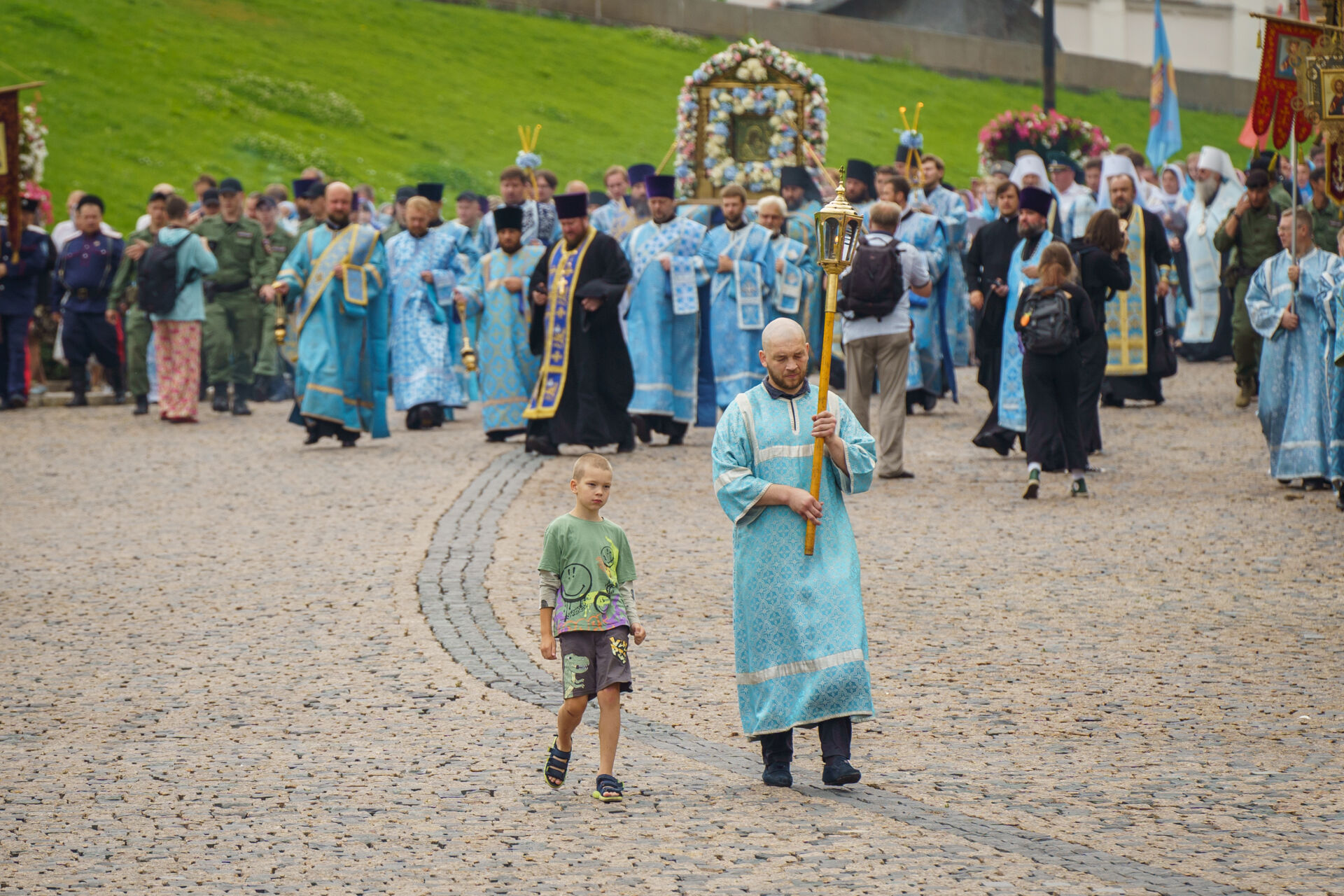 Погода выдалась умеренно прохладной, в небе кричали и вились стрижи, но вскоре их перебил колокольный звон - из собора вынесли Казанскую икону в праздничном киоте, украшенном цветами, и начался Крестный ход. Люди шли за иконой и пели, в руках они несли флаги с образами Спасителя и Богородицы. На расстоянии шествие напоминало реку, которая извилистой линией охватила Кремль.