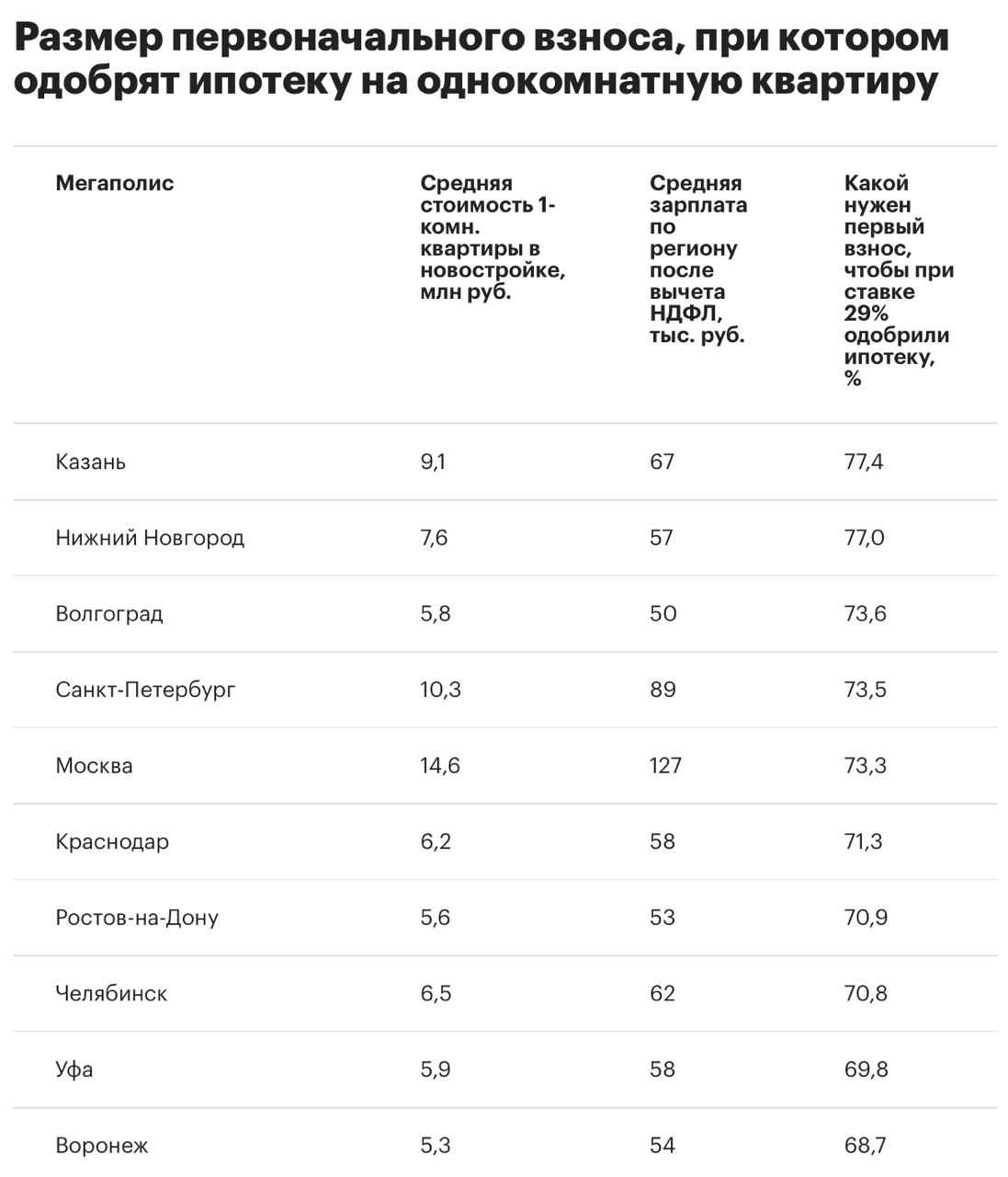 Первый взнос по ипотеке на однушку превысил 70% уже в половине российских городов-миллионников. Если он меньше, банки просто отказывают в кредите.