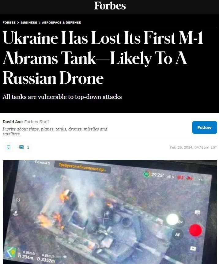 Forbes подтвердил, что ВСУ потеряли свой первый танк M-1 Abrams.