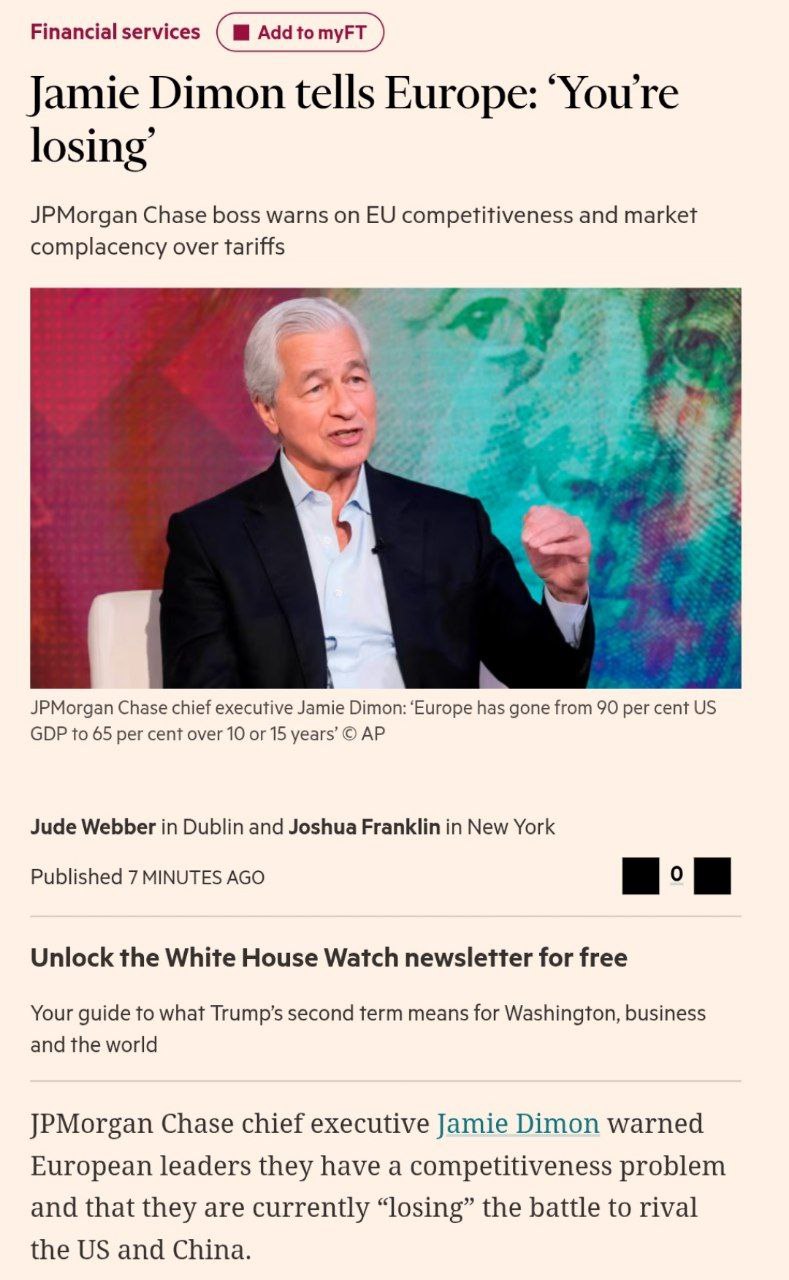 «Вы проигрываете». Гендиректор JPMorgan Chase Джейми Даймон предупредил европейских лидеров, что у них проблемы с конкурентоспособностью, они «проигрывают» битву США и Китаю.