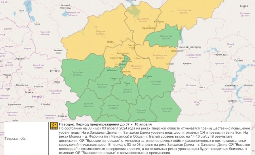 Известно, что предупреждение связано с «высоким половодьем» на реке Западная Двина в одноименном городе, реке Молога в деревне Фабрика под Максатихой и реке Обще в Белом. Отмечается затопление речных пойм и расположенных в них некапитальных сооружений и участков дорог.