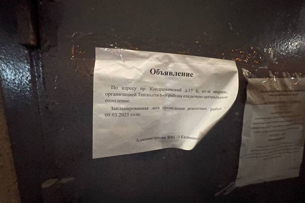 На дверях парадной дома 17Б на Кондратьевском проспекте висит объявление: из-за аварии отключили центральное отопление. Жители третий день греются от весьма опасных электрических обогревателей, а работы обещают провести только 9 марта.