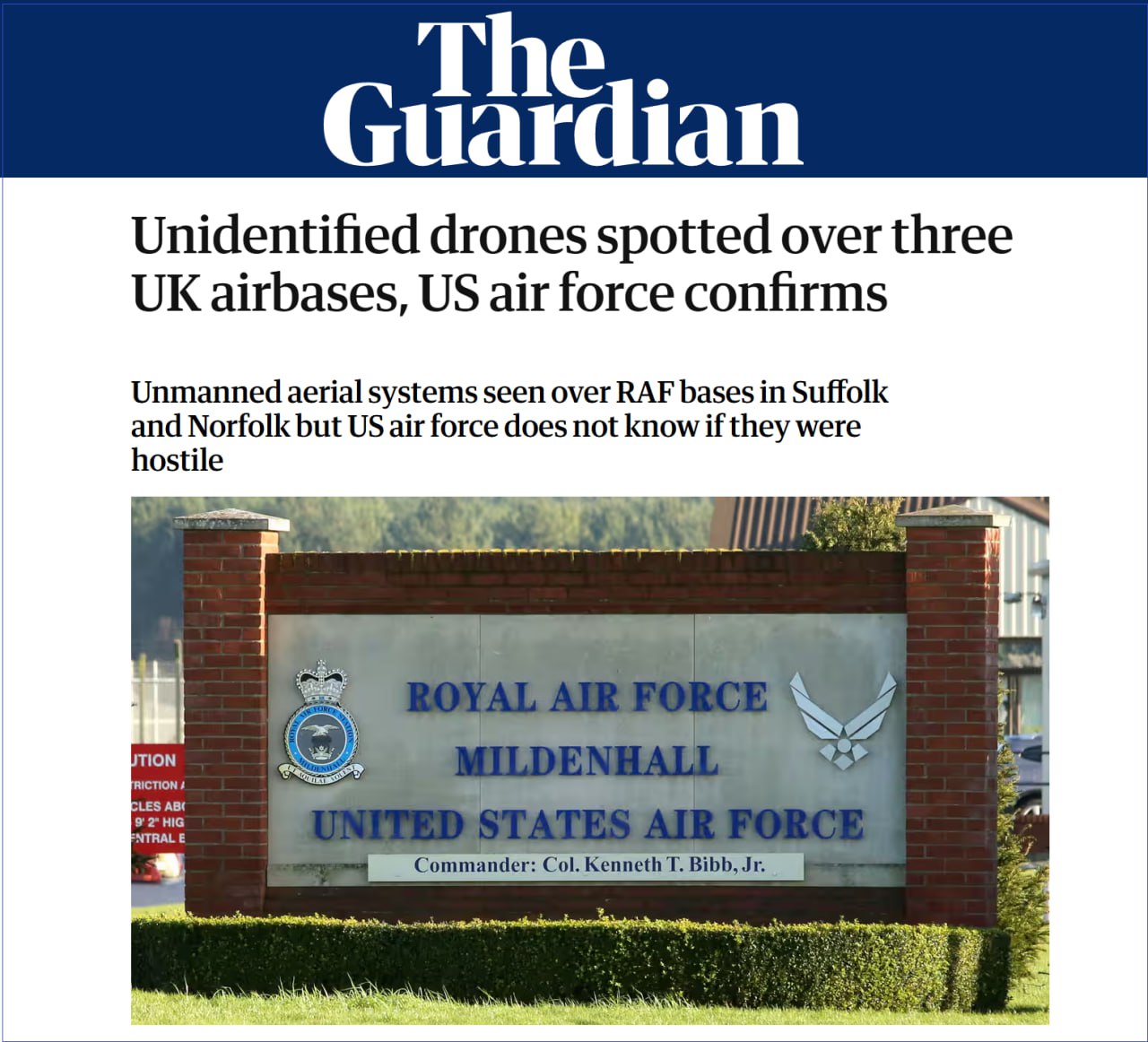 Речь идёт об аппаратах небольшого размера, которые были замечены над базами Лейкенхит и Милденхолл на востоке Англии и возле базы Фелтуэлл в Норфолке. Данные объекты также используются американскими военными.