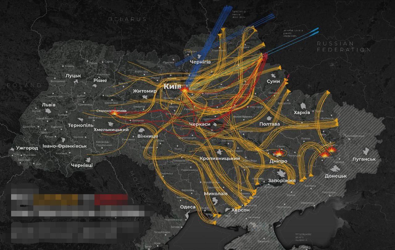 Схема ночных ударов ВС РФ по целям на территории Украины. Основной упор был сделан на цели в Киеве.