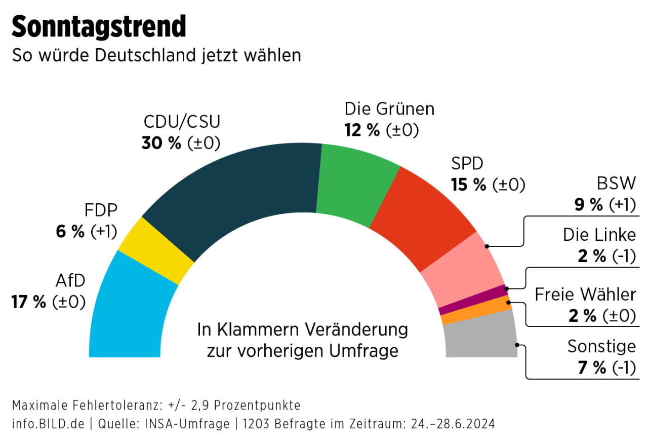 🇩🇪 Если бы выборы в бундестаг состоялись сегодня, Союз Сары Вагенкнехт (BSW) получил бы 9% голосов. Таковы результаты опроса социологического института INSA.