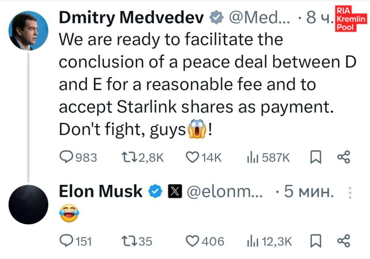 Маск оценил предложение Медведева помирить их с Трампом за акции Starlink.
