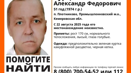ПСО "ЛизаАлерт" сообщил о пропаже 51-летнего жителя поселка Плотниково Промышленновского округа. Местонахождение Бурцева Александра Федоровича остается неизвестным с пятницы, 22 августа.
