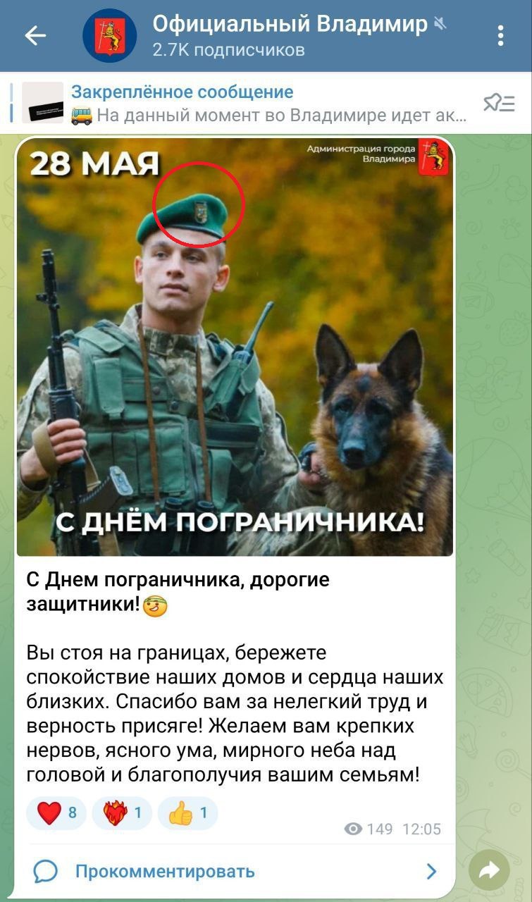 После скандала с грамотами в барнаульской школе «отметилась» и мэрия Владимира. Там в официальном паблике поздравляли с Днём пограничника. Правда непонятно какого. Ибо на фото — украинский военный со значком на берете. А там и трезубец, и жовто-блакитный пограничный столб…