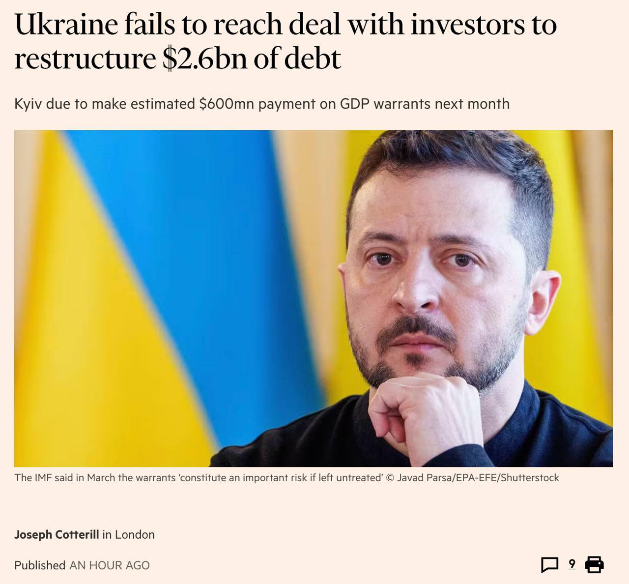 Украина может объявить дефолт уже в мае Как пишет Financial Times, Киев не смог договориться с инвесторами о реструктуризации долга в 2,6 млрд долларов. В следующем месяце страна должна выплатить 600 млн долларов по ценным бумагам, привязанным к ВВП. «Киеву предстоит решить, объявлять ли дефолт по выплате почти 600 млн долларов, которая должна быть произведена в конце мая и связана с экономическими результатами 2023 года», - говорится в материале. ЖИВОВZ