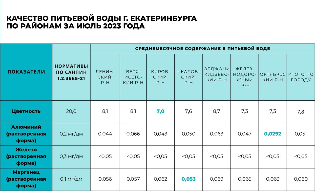 По показателю цветности и содержанию марганца сейчас хуже всего обстоят дела в Орджоникидзевском районе, а по содержанию алюминия — в Верх-Исетском. Лучше всего ситуация в Кировском, Октябрьском и Чкаловском районах.