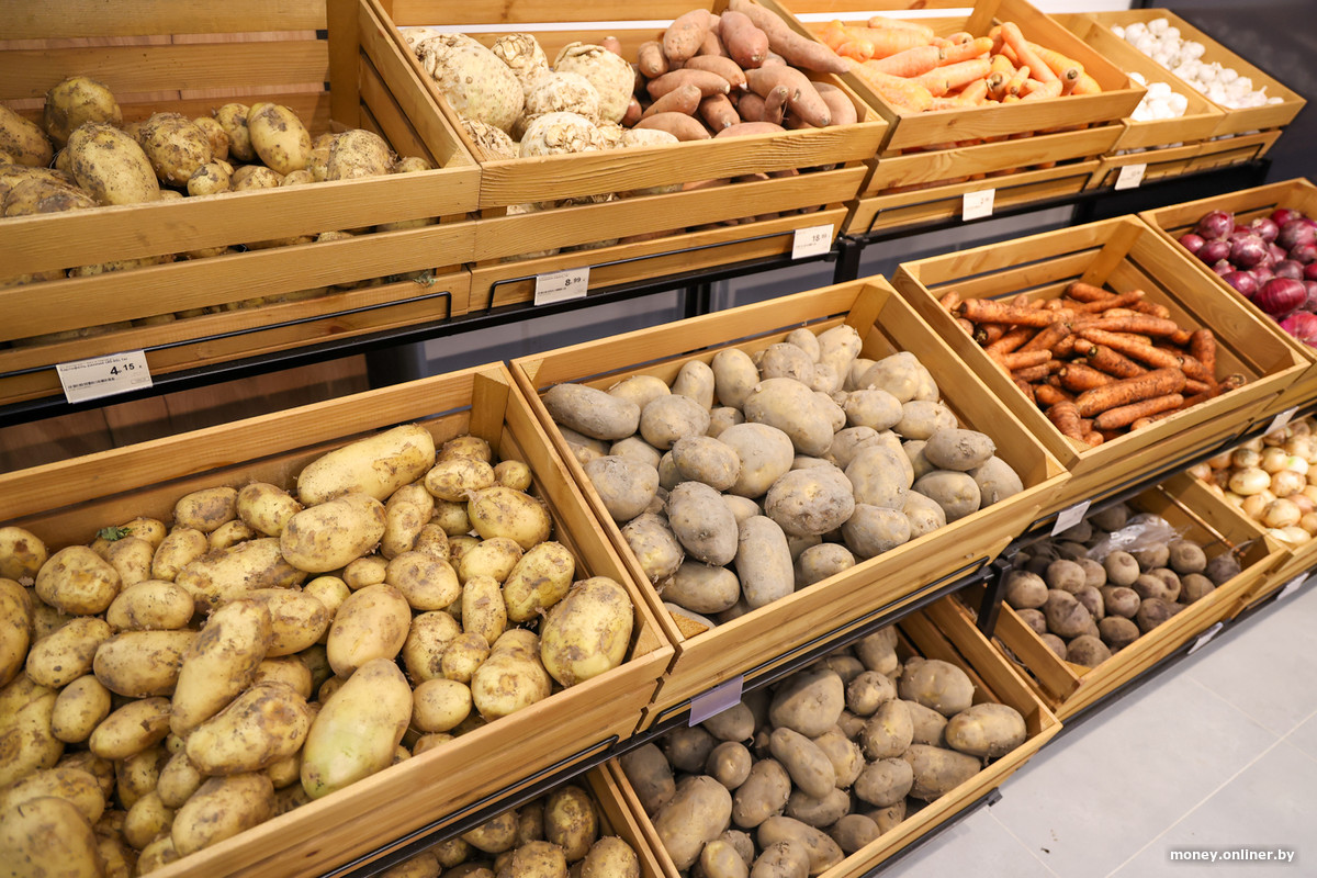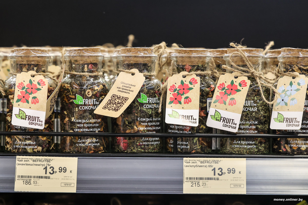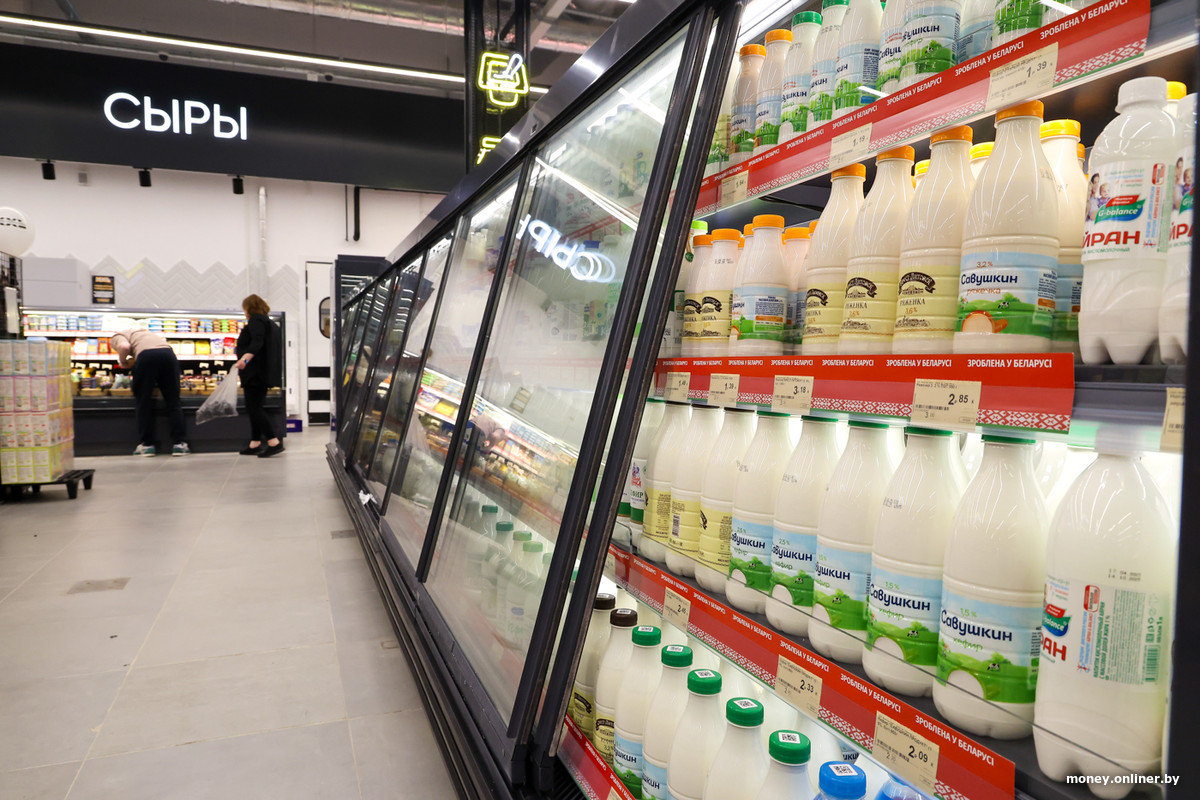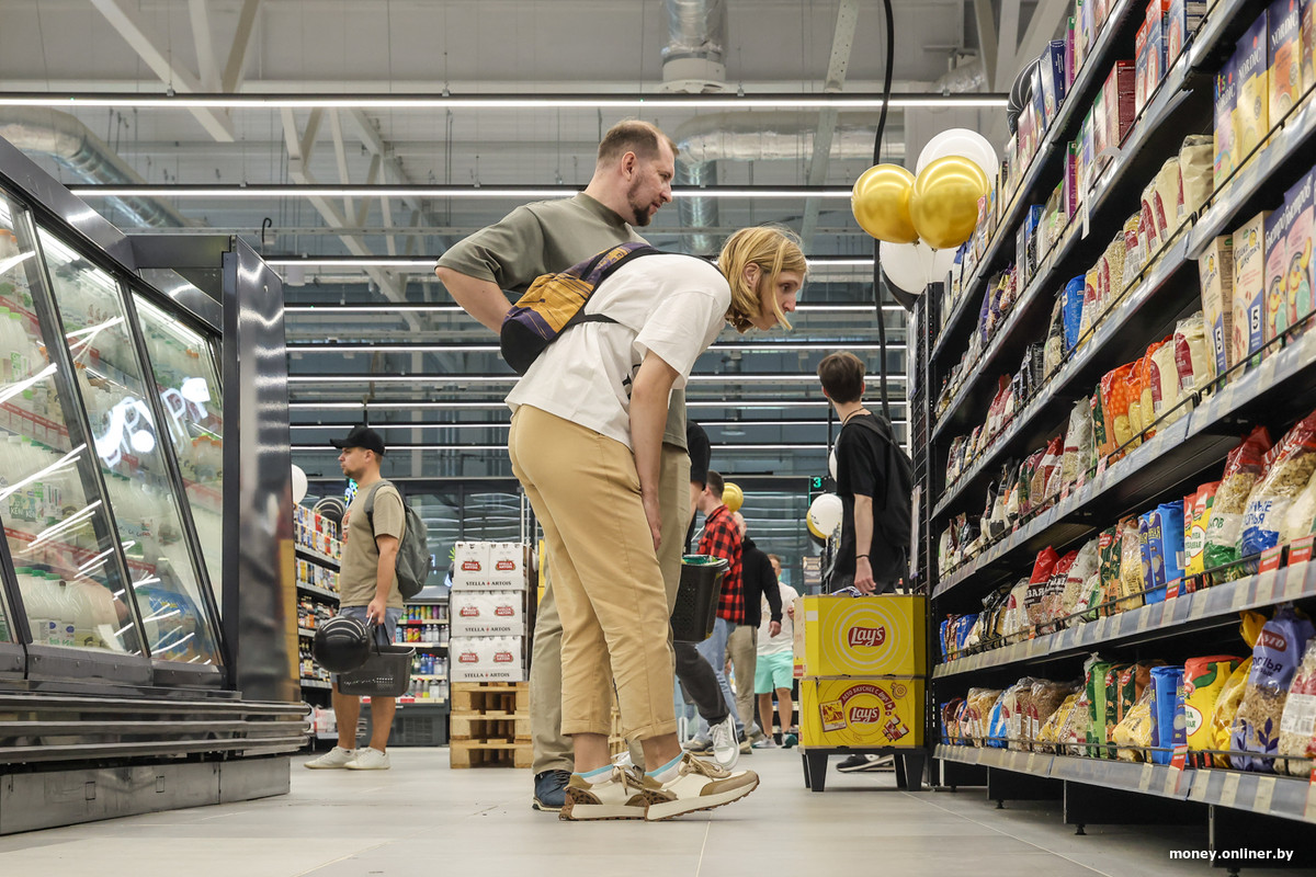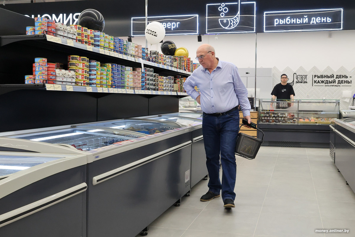 В магазине представлен ассортимент из более чем 10 000 наименований продуктов — от базовых товаров до специализированных позиций, включая продукцию белорусских и зарубежных производителей. В продаже есть мясо, рыба, молочные продукты, заморозка, бакалея, чай, кофе, сладости, овощи и фрукты.