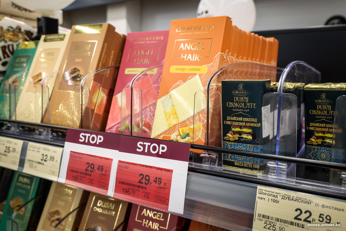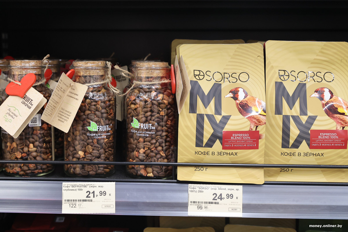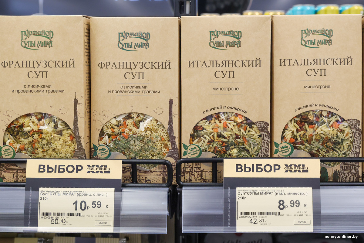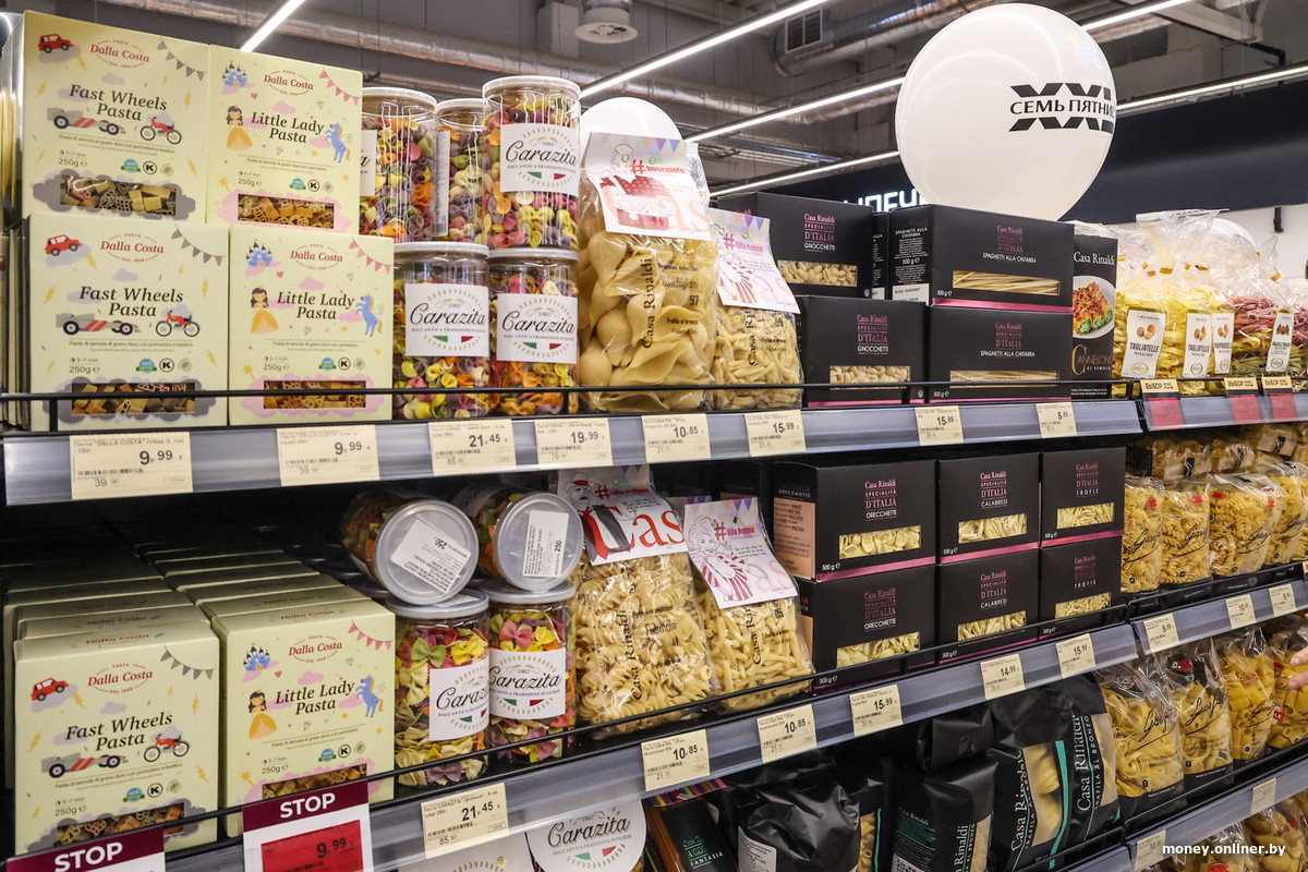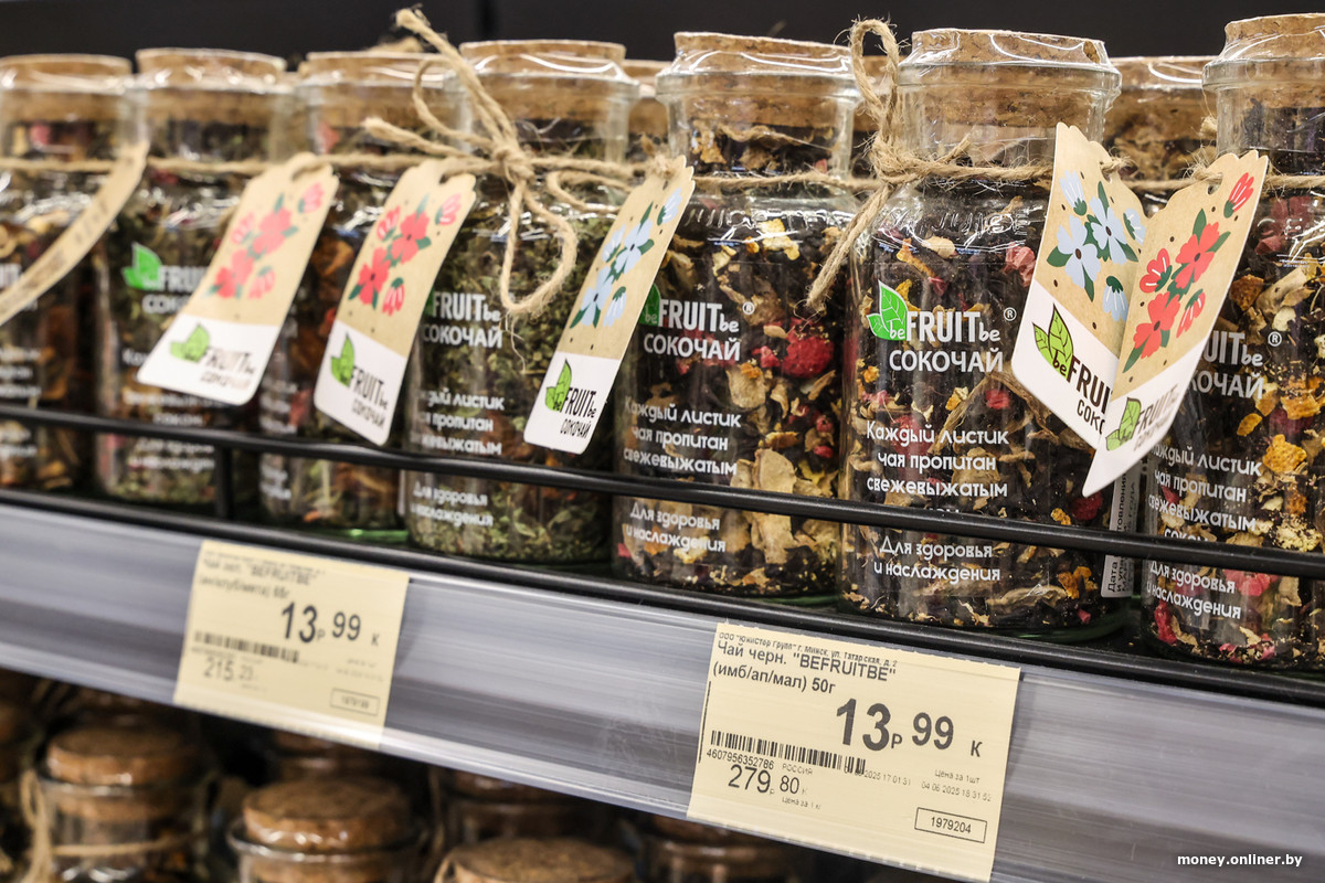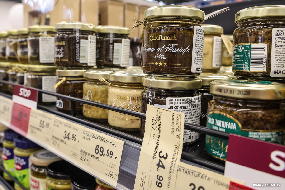 В магазине представлен ассортимент из более чем 10 000 наименований продуктов — от базовых товаров до специализированных позиций, включая продукцию белорусских и зарубежных производителей. В продаже есть мясо, рыба, молочные продукты, заморозка, бакалея, чай, кофе, сладости, овощи и фрукты.