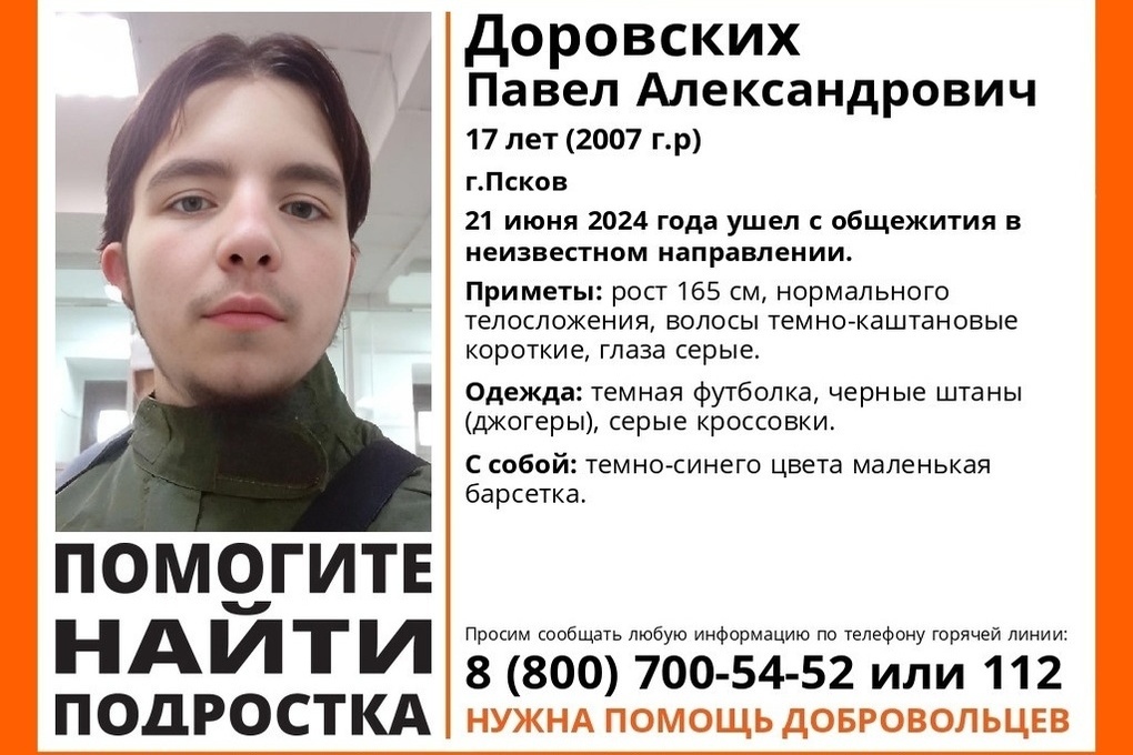17-летнего Павла Доровского разыскивают в Пскове. Об этом «МК в Пскове» сообщили в отряде «Лиза Алерт» Псковской области.