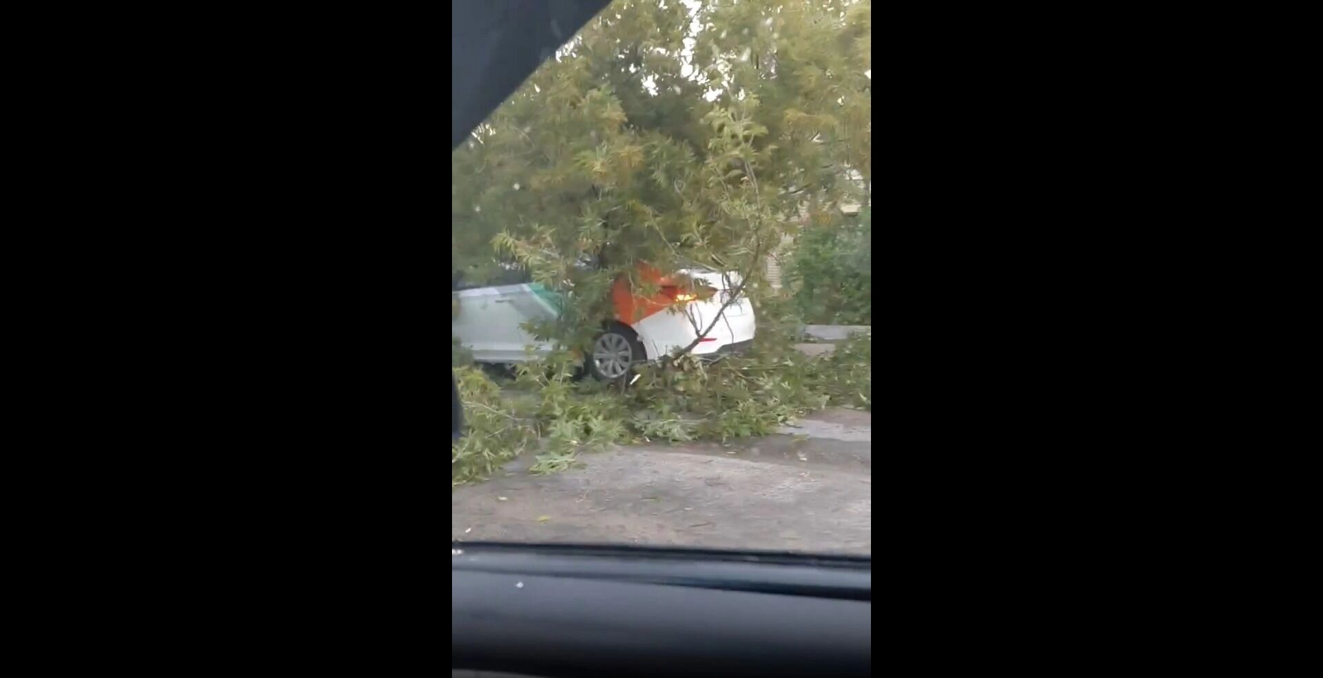 Ветер повалил множество деревьев. Одно из них упало на каршеринговое авто, которое ехало по дороге. Водитель якобы успел вовремя затормозить и остался цел.