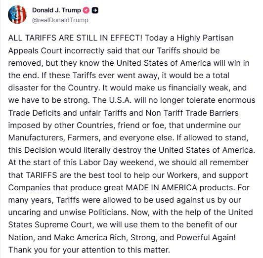 Апелляционный суд признал действия американского лидера незаконными – оказывается, у президента США нет полномочий по введению тарифов на импорт. Пошлины все еще в силе до 14 октября, чтобы Белый дом мог обжаловать решение.