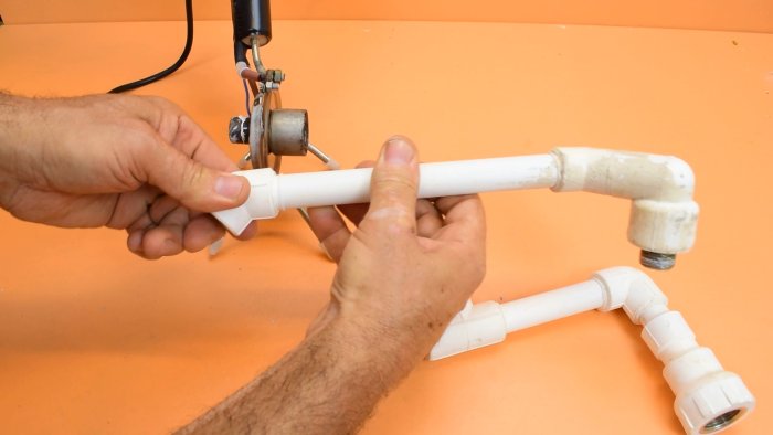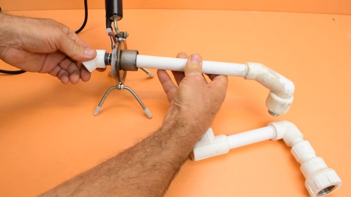 Подаем на наш импровизированный аппарат для сварки пластиковых труб и фитингов напряжение, нагреваем пластиковые элементы и соединяем, образуя прочный и герметичный стык.