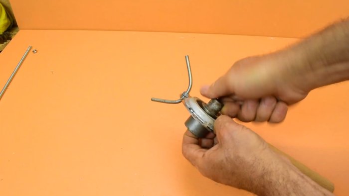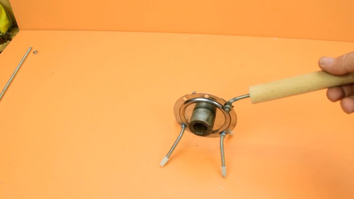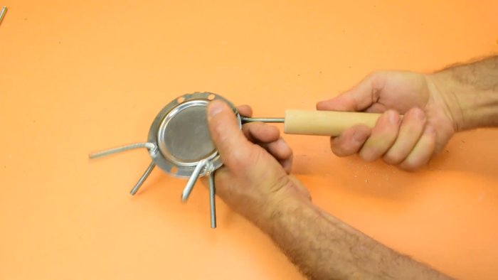 Третий стержень с двумя гайками на конце нагреваем в пламени газовой горелки и сгибаем конец с гайками почти на 90 градусов. Согнутый короткий конец стержня с одной гайкой заводим в отверстие обечайки и с другой стороны закрепляем второй гайкой. На длинный конец стержня накручиваем деревянную ручку с центральным глухим отверстием.