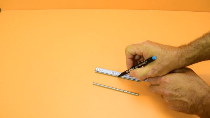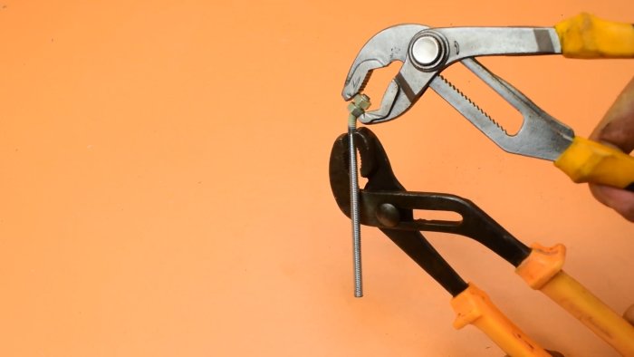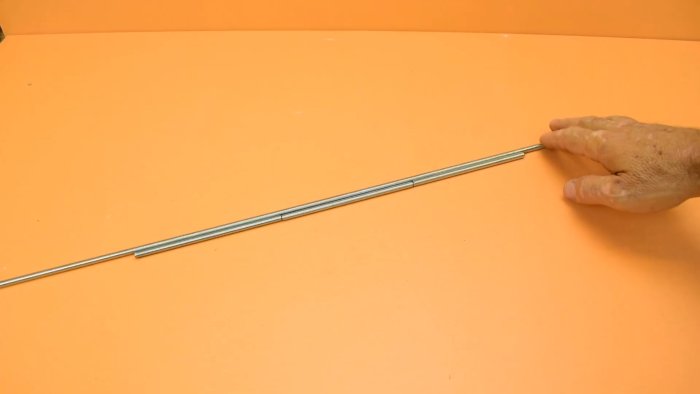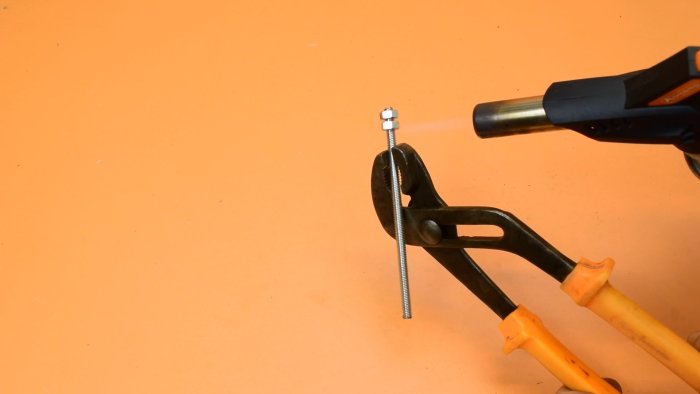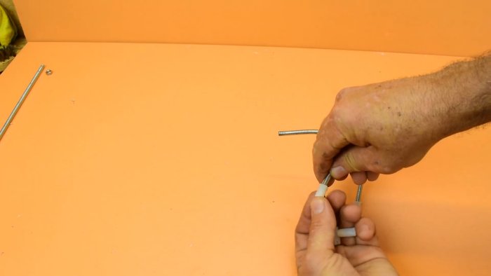 От стального стержня с наружной резьбой отрезаем 3 заготовки одинаковой длины. Две из них вставляем в два крепежных отверстия, разделенных третьим, на обечайке вокруг нагревательного элемента.
